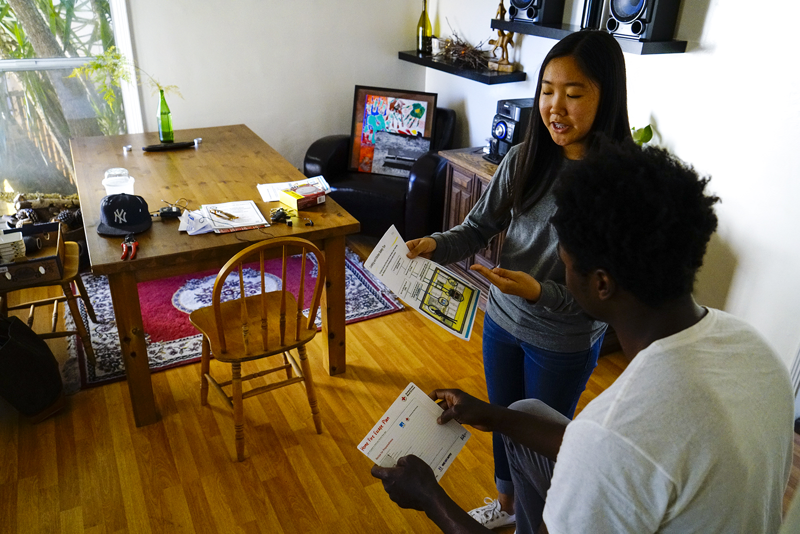 - Amanda Deng, volunteer of the American Red Cross, explains fire safety to Fruitvale resident, Michael McGee, as part of the Home Fire Preparedness Campaign on Saturday October 8, 2016. (Yesica Prado/Oakland North)