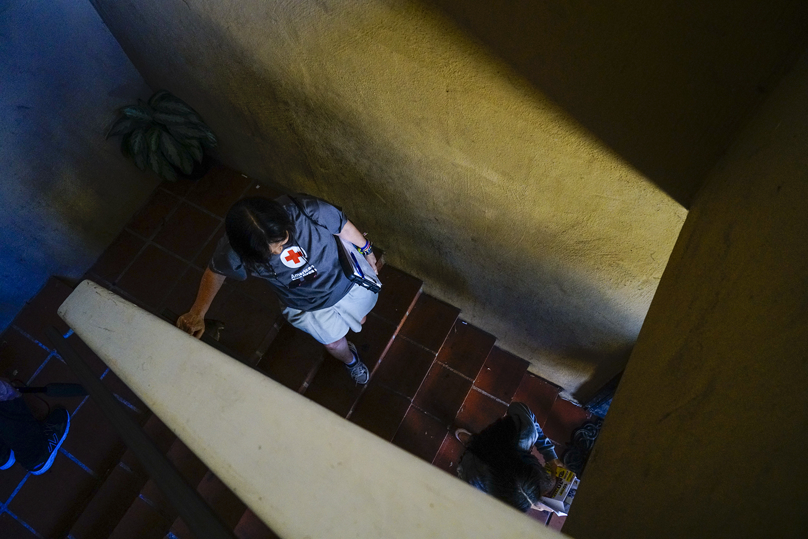 - American Red Cross volunteer goes down the steps of a Fruitvale home after installing three new smoke alarms in the residence of Francisco Fonseca as part of the Home Fire Preparedness Campaign on Saturday October 8, 2016. (Yesica Prado/Oakland North)