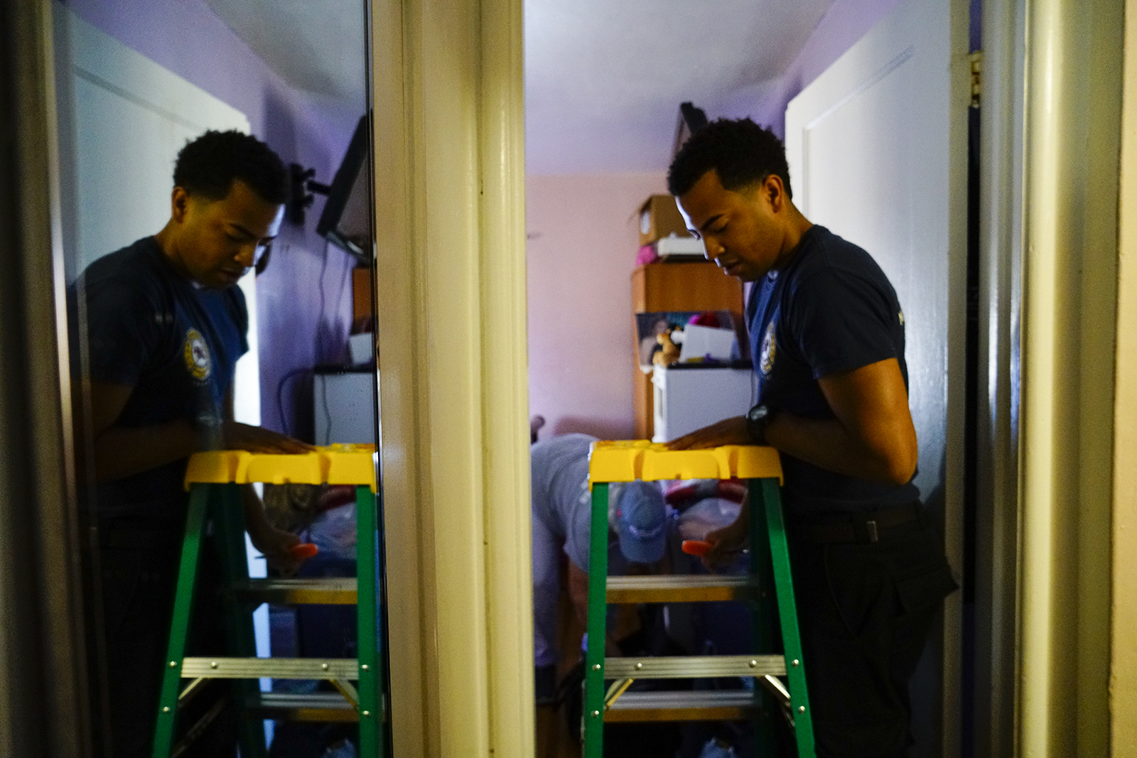 - Eduardo Robles, Bay EMT, and American Red Cross volunteer work on a home, chaging an old smoke alarm in Fruitvale on Saturday, October 8, 2016. (Yesica Prado/Oakland North)