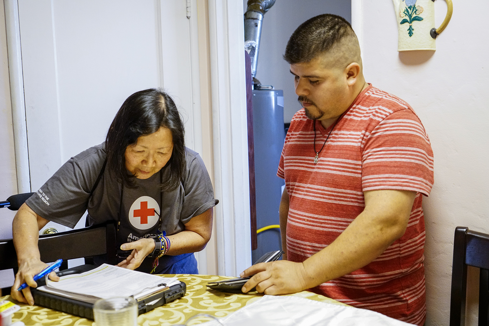 - American Red Cross volunteer discusses fire safety with Francisco Fonseca, right, after installing three new smoke alarms as part of the Home Fire Preparedness Campaign on Saturday October 8, 2016. (Yesica Prado/Oakland North)