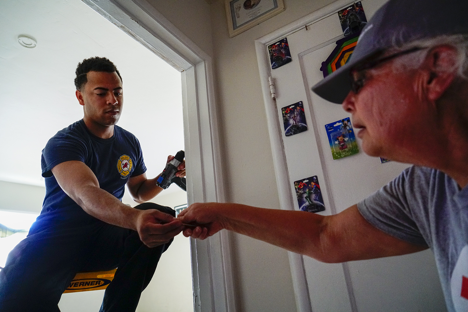 - Eduardo Robles, left, and American Red Cross volunteer, right, work together in a Fruitvale resident’s home to install a new smoke alarm as part of the Home Fire Preparedness Campaign on Saturday October 8, 2016. (Yesica Prado/Oakland North)