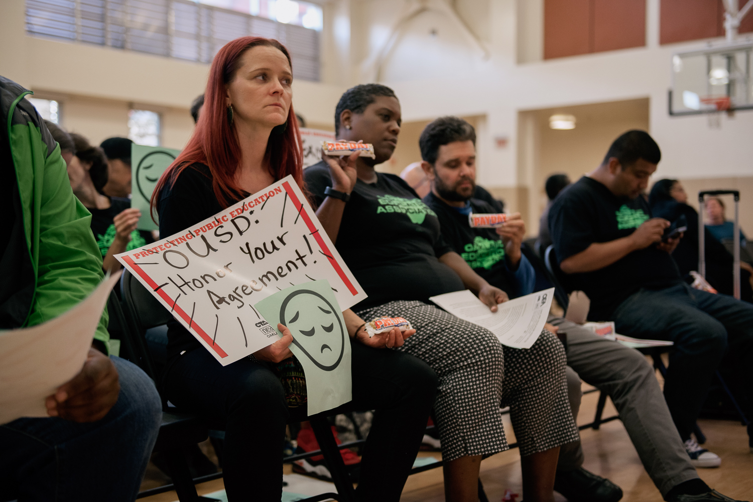 “Trick or treat/ so petite/ our promised raise is incomplete!” sang union members of the Oakland Education Association (OEA) at a lively school board meeting at La Escuelita Elementary School Wednesday night. School board directors carried out business as usual over the chants, but faltered a few times as they discussed budget matters, and heard from two charter schools seeking renewal.