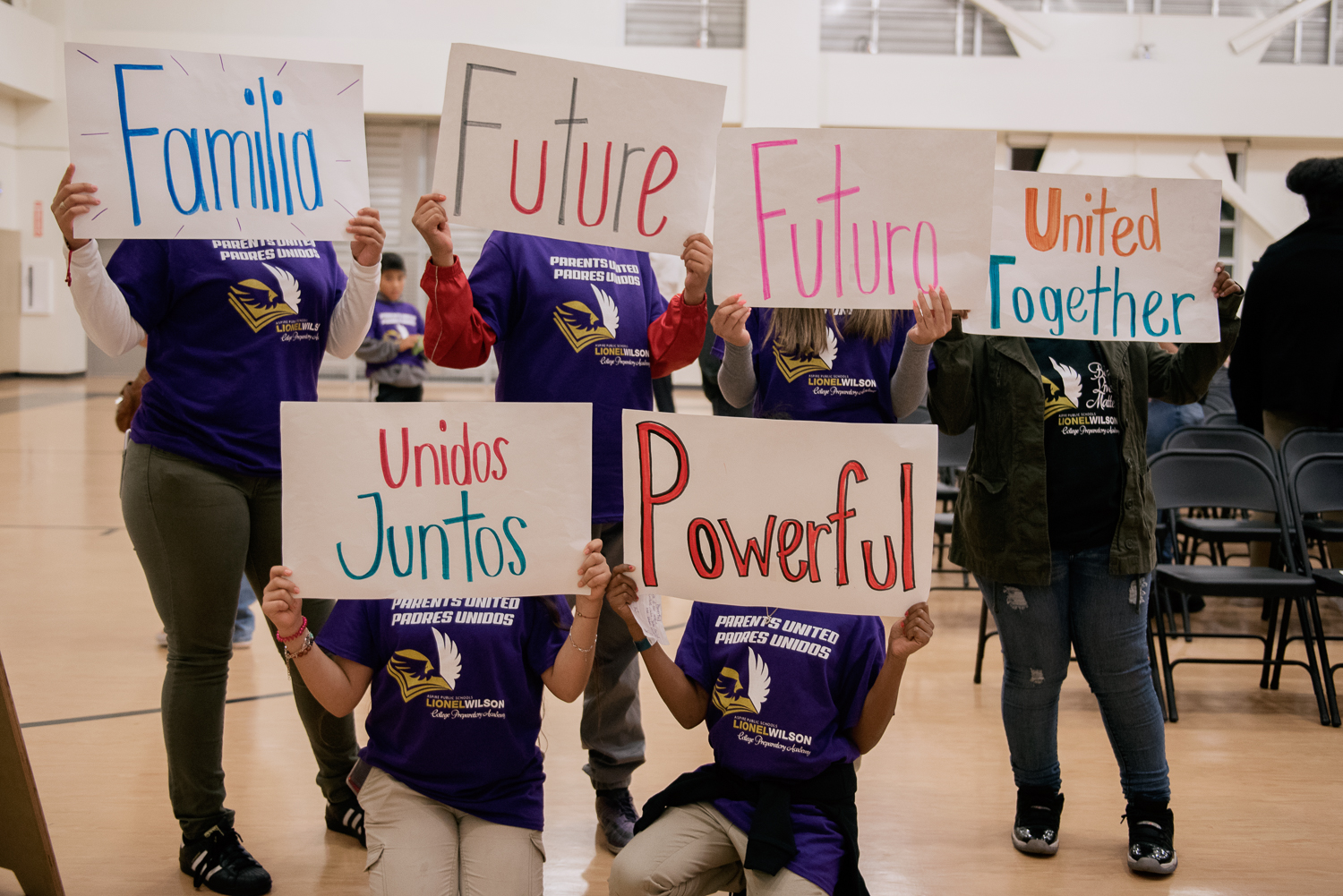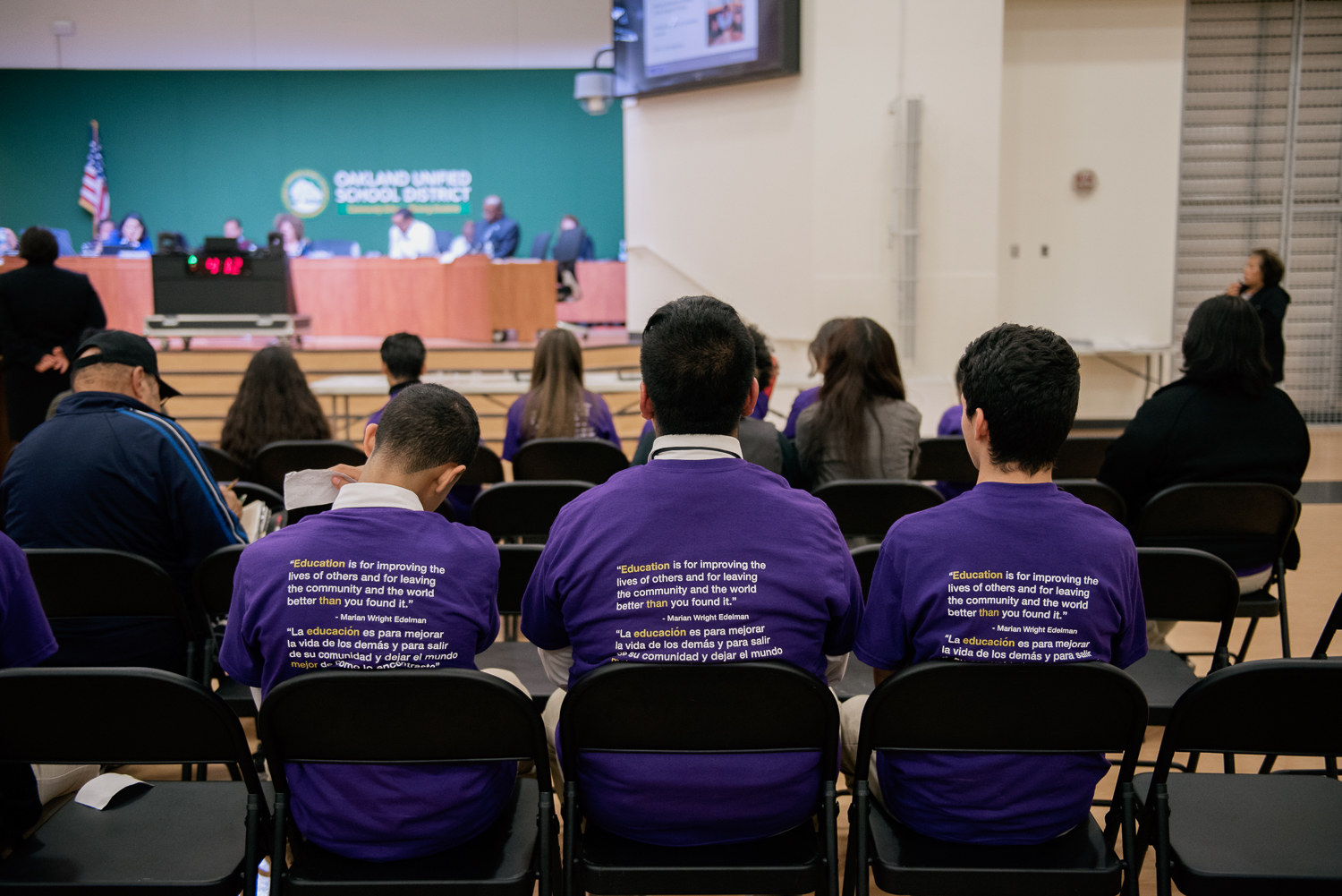 Those wearing purple hailed from Aspire Lionel Wilson College Preparatory Academy, located in East Oakland, for their charter school’s renewal hearing. Their assistant principal, Tambra Mola, estimated that approximately 70 students, teachers and parents had shown up to voice their support of the renewal. Several mothers spoke, mostly in Spanish, about how the school is an essential part of their community and had helped their children get into college.