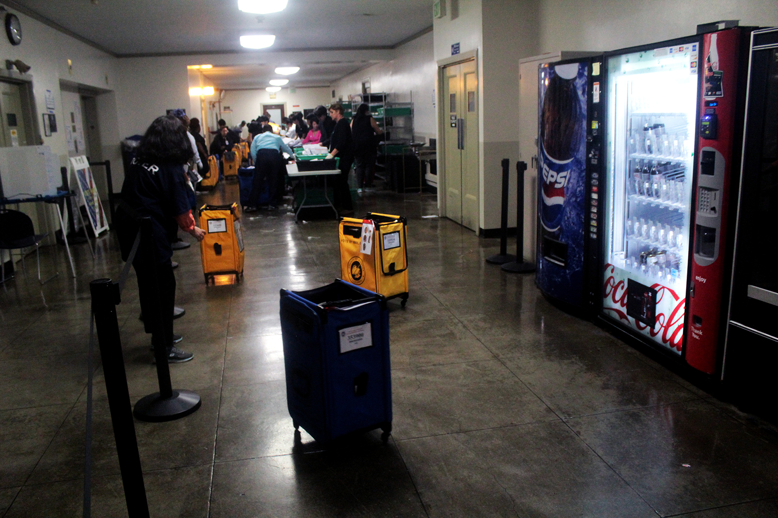 Inside the building, dozens of employees—Ashley estimates up to 100—were preparing for the vote-by-mail ballots to come in. On the basement floor, adjacent to the garage where the trucks drop the ballots off, ROV employees formed a human chain to pass wheeled baskets that will hold the votes. Ashley said the ROV will not even start counting the vote-by-mail ballots Tuesday tonight, and the workers are only getting them ready to be counted starting Wednesday. Tonight, the office will focus on the in-person votes cast on election day.
