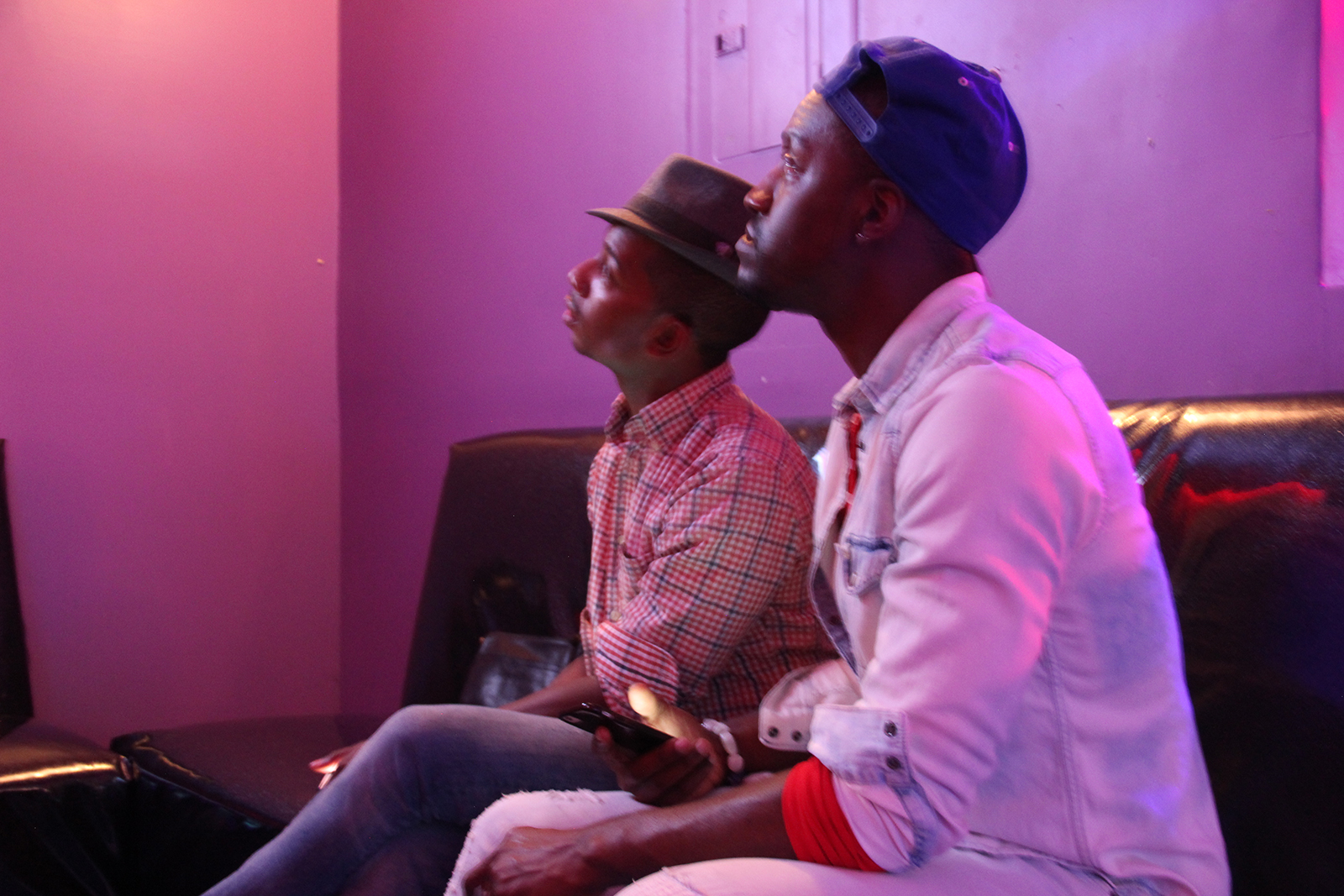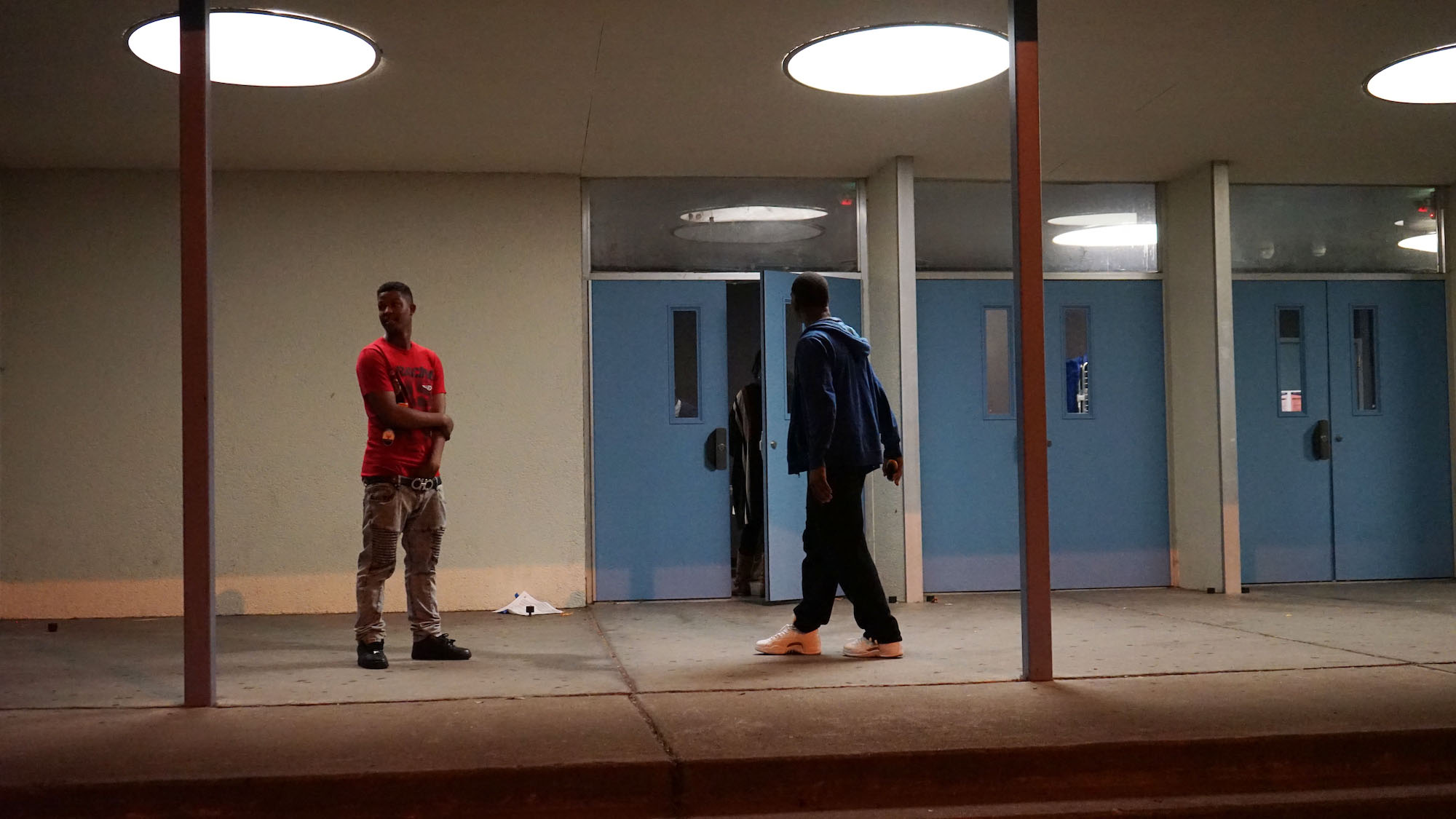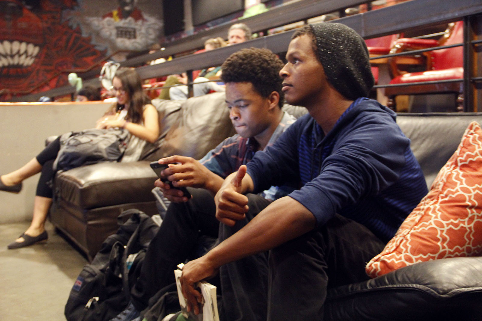High school student Steven Beard, left, and his friend watch results on one of The New Parkway's theaters. Photo by Ryan Lindsay.