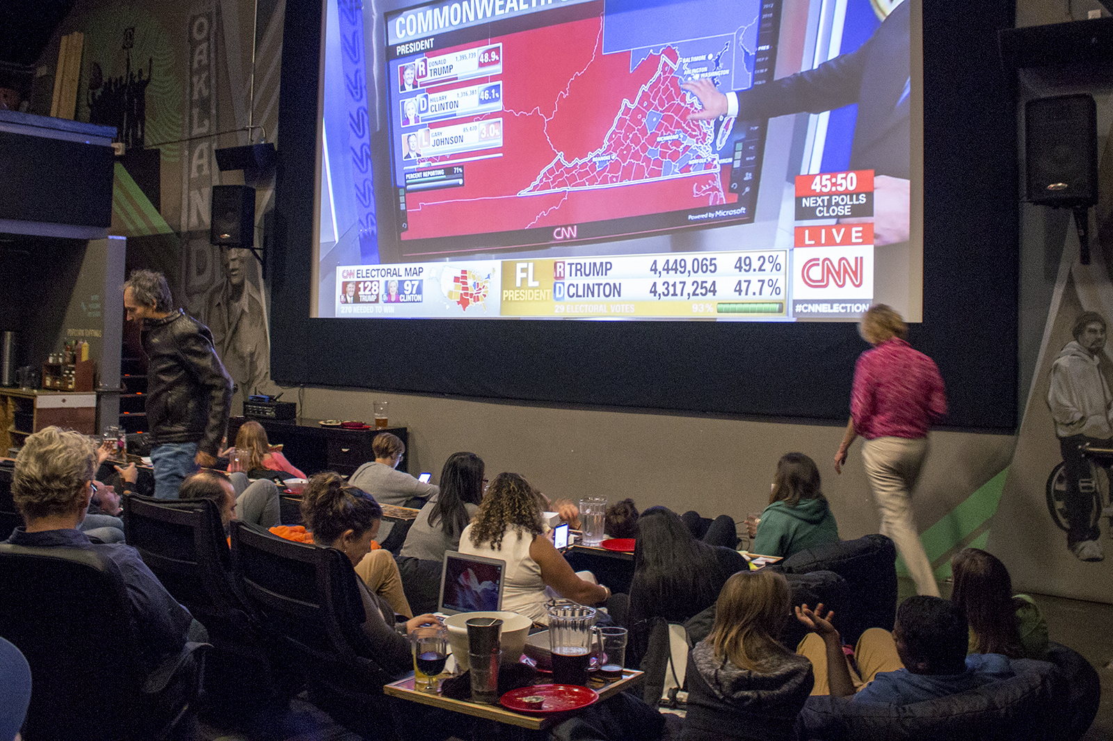 As national results poured in from national news outlets, Oakland residents grew increasingly more anxious. At the New Parkway Theater, the crowd in a screening room shifted from applause when Clinton won New Mexico to boos after hearing that Trump would likely take Missouri.