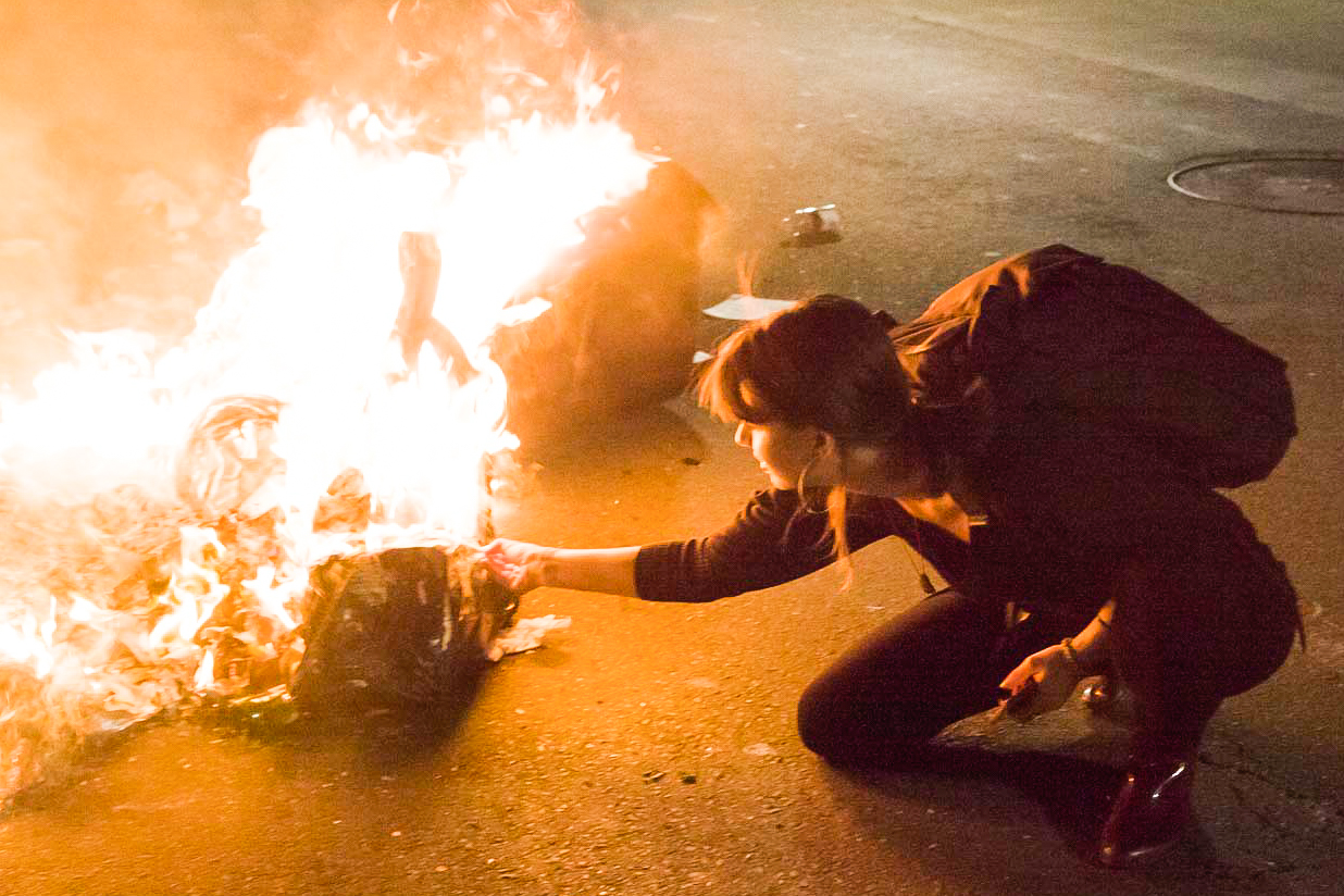 - A garbage can is lit on fire after protestors marched down Broadway. Protestors began lighting up fires with nearby garbage cans, expressing their anger at the presidential election results. (Yesica Prado/Oakland North)