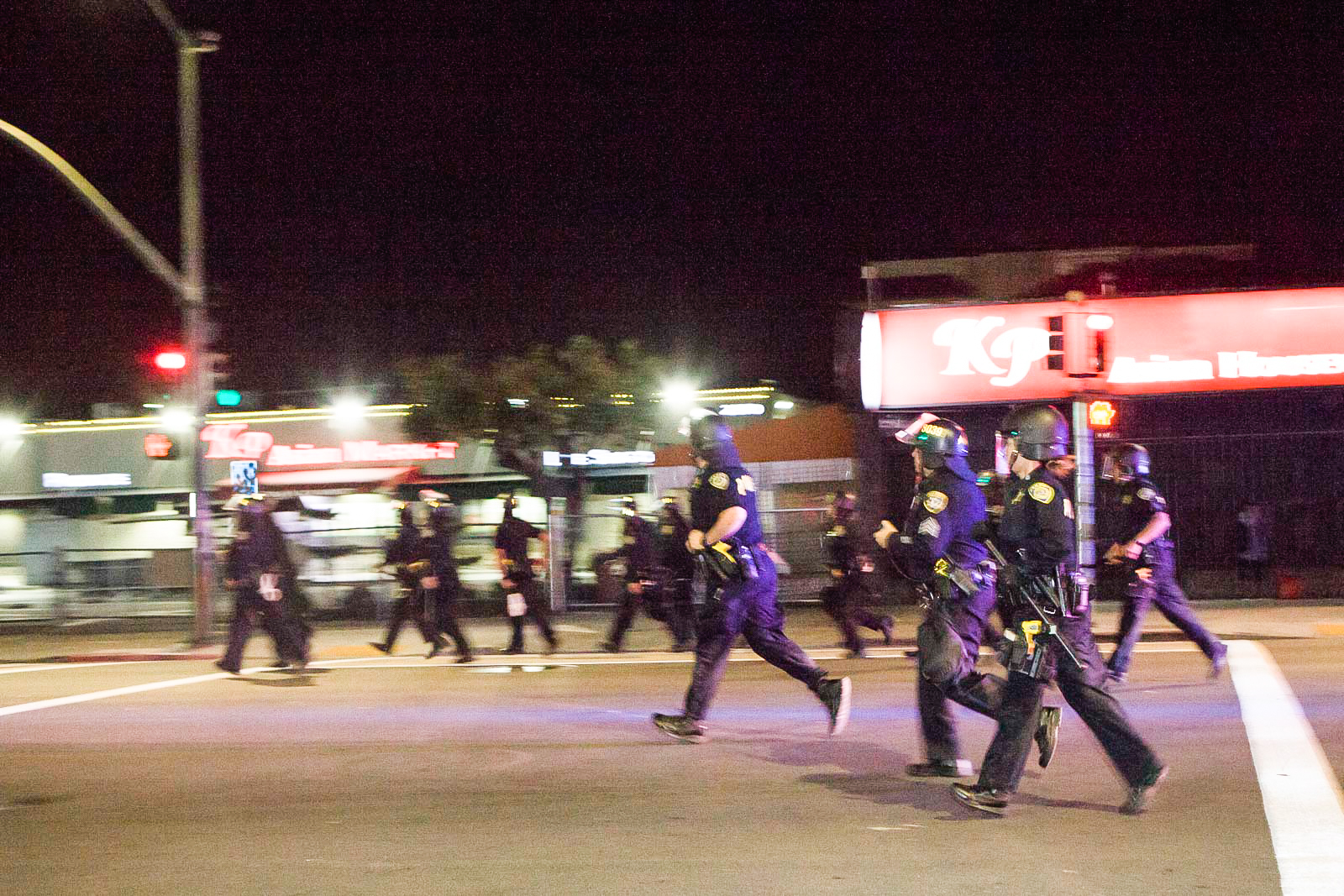 - Oakland Police rushed protesters on Telegraph Avenue at around 12:30 AM. Photo by Mary Newman