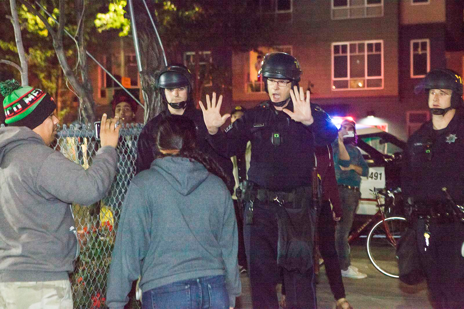 - Oakland Police officers tried to calm the crowd but were met with increased resistance. One female protester began yelling “We don’t want a country like this, we don’t want you to be the enemy!” Photo by Mary Newman