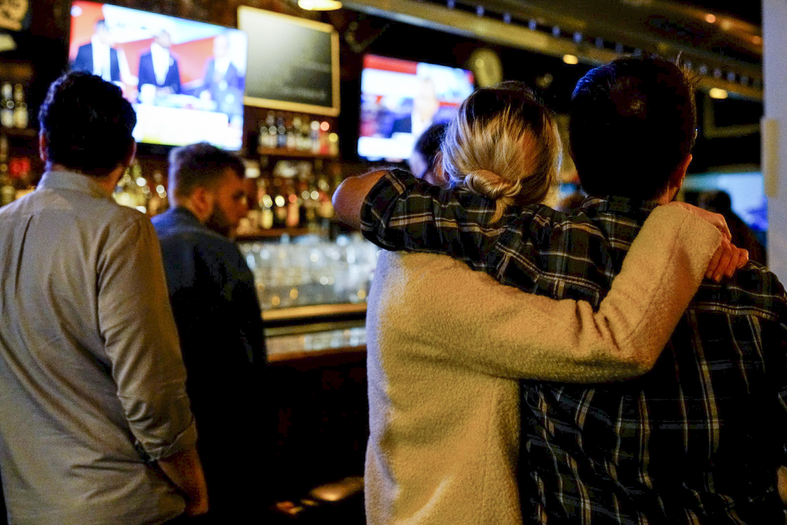 - A couple embraces as they watch the results of the elections on CNN at the Kingfish bar in Oakland. (Yesica Prado/Oakland North)