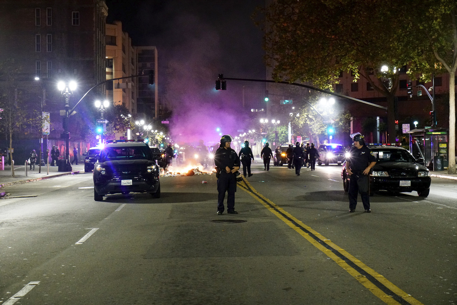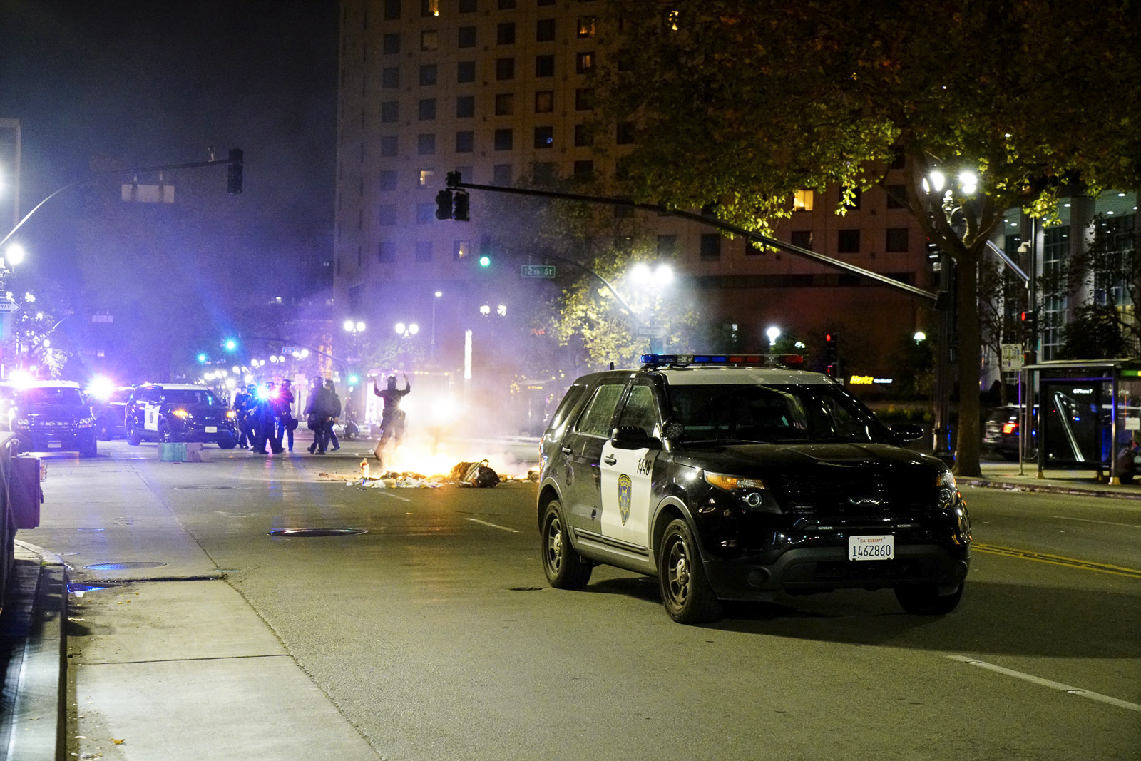 - Scenes of Oakland at night after the protestors have passed through Broadway in downtown Oakland. Protestors began by marching peacefully after the presidential results announced Donald J. Trump as new president of the U.S. (Yesica Prado/Oakland North)