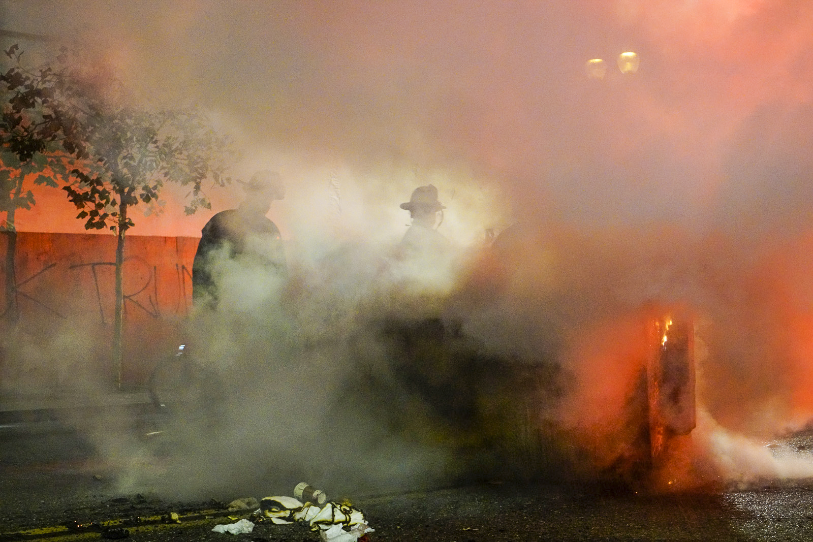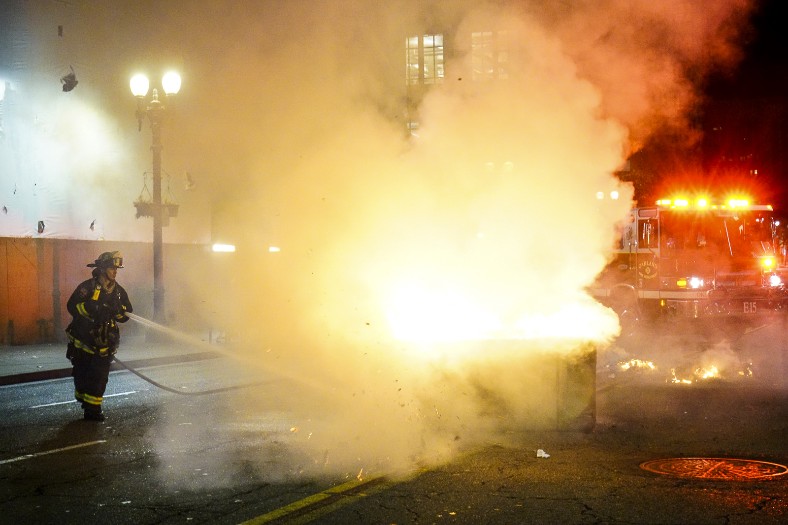 - Oakland firefighters put out the garbage can fires left in the middle of the street on Broadway. (Yesica Prado/Oakland North)