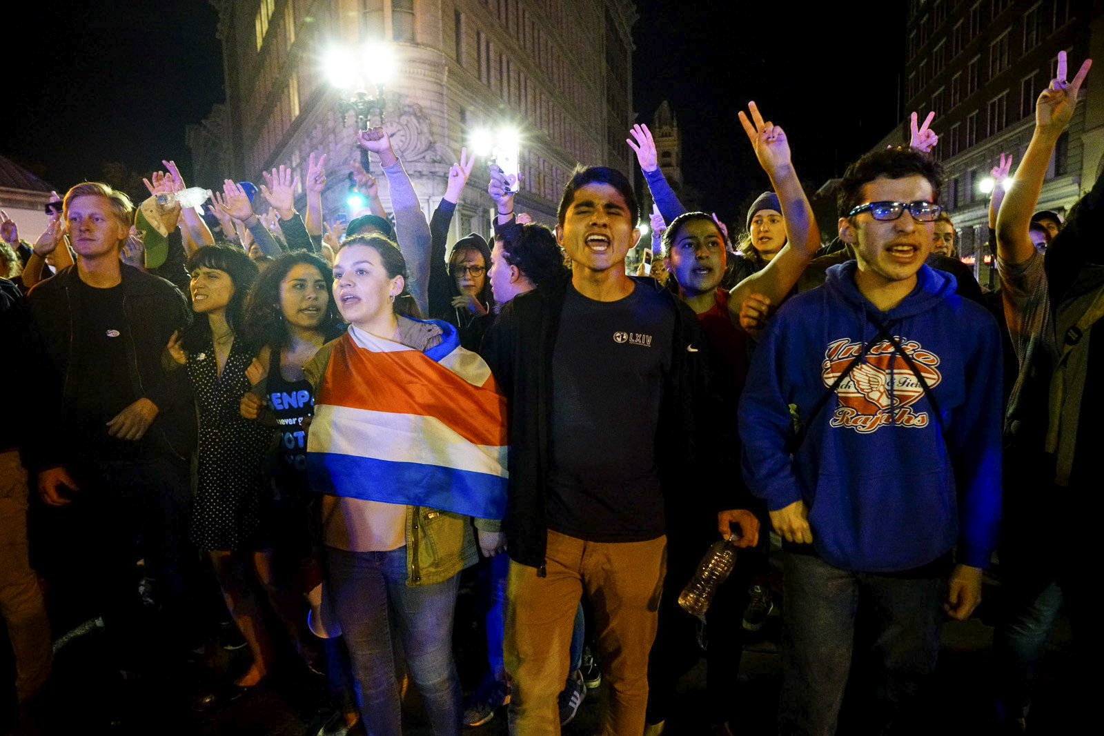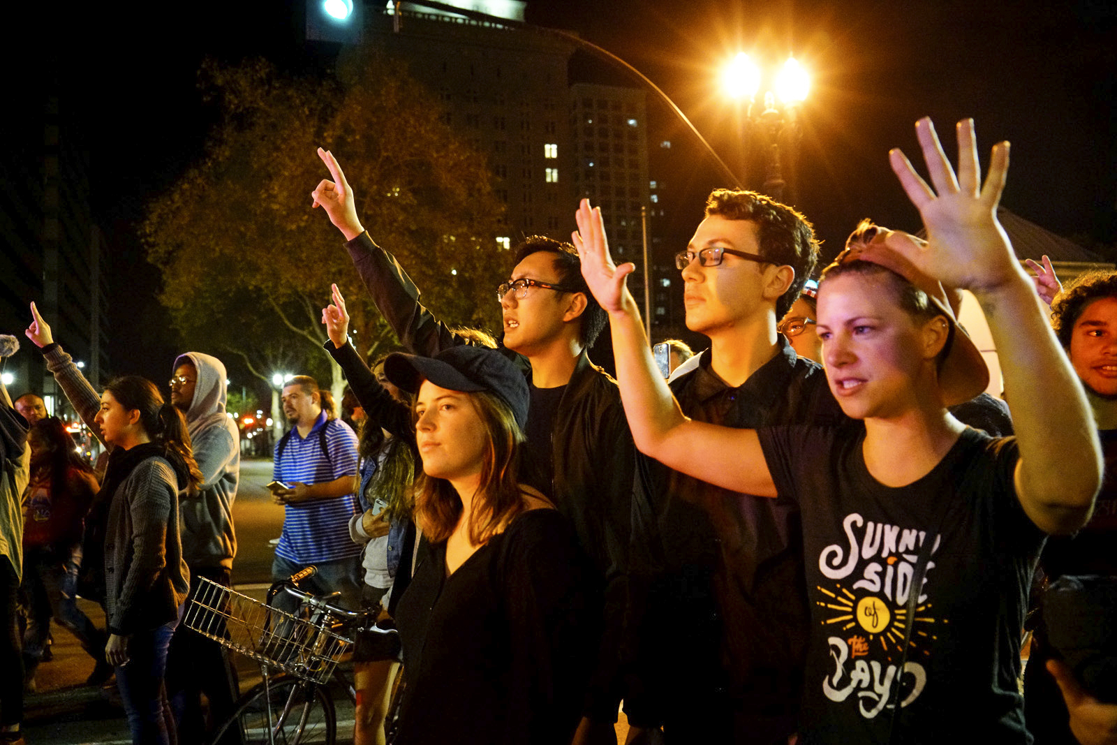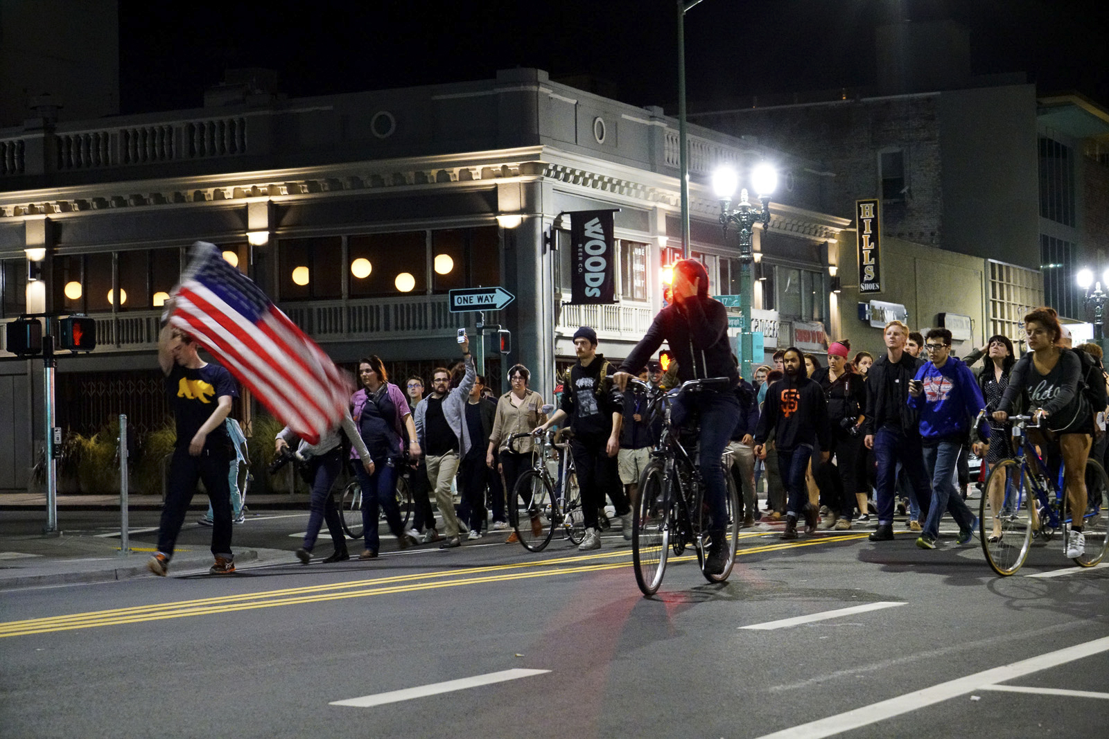 Late Tuesday night, as president-elect Donald Trump was giving his victory speech, a group of protesters moved through downtown Oakland demonstrating against the results of the election.