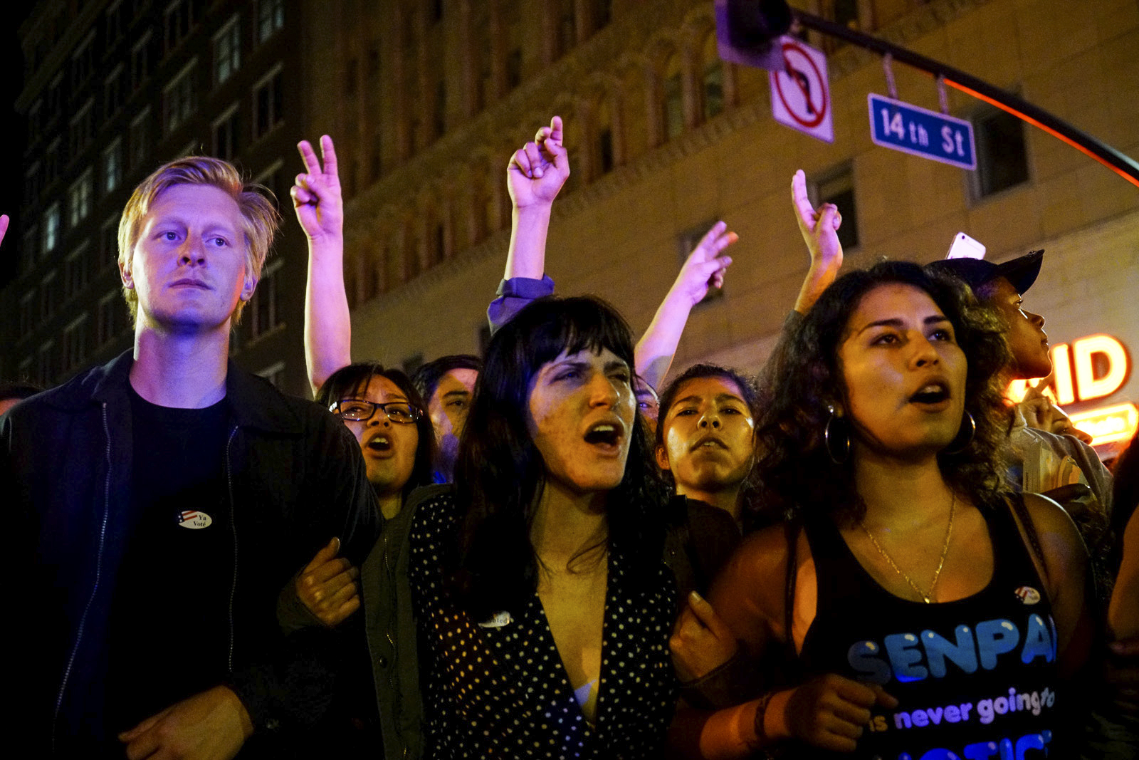- Protestors march down 14th Street and Broadway, yelling “Not my president!” and “Fuck Donald Trump!” in reaction to the election results. Police met protestors at this intersection to stop them until they received orders to step aside. Around 1:36 a.m. police stepped aside from the intersection and protestors continued to march, expressing their angry feelings. (Yesica Prado/Oakland North)