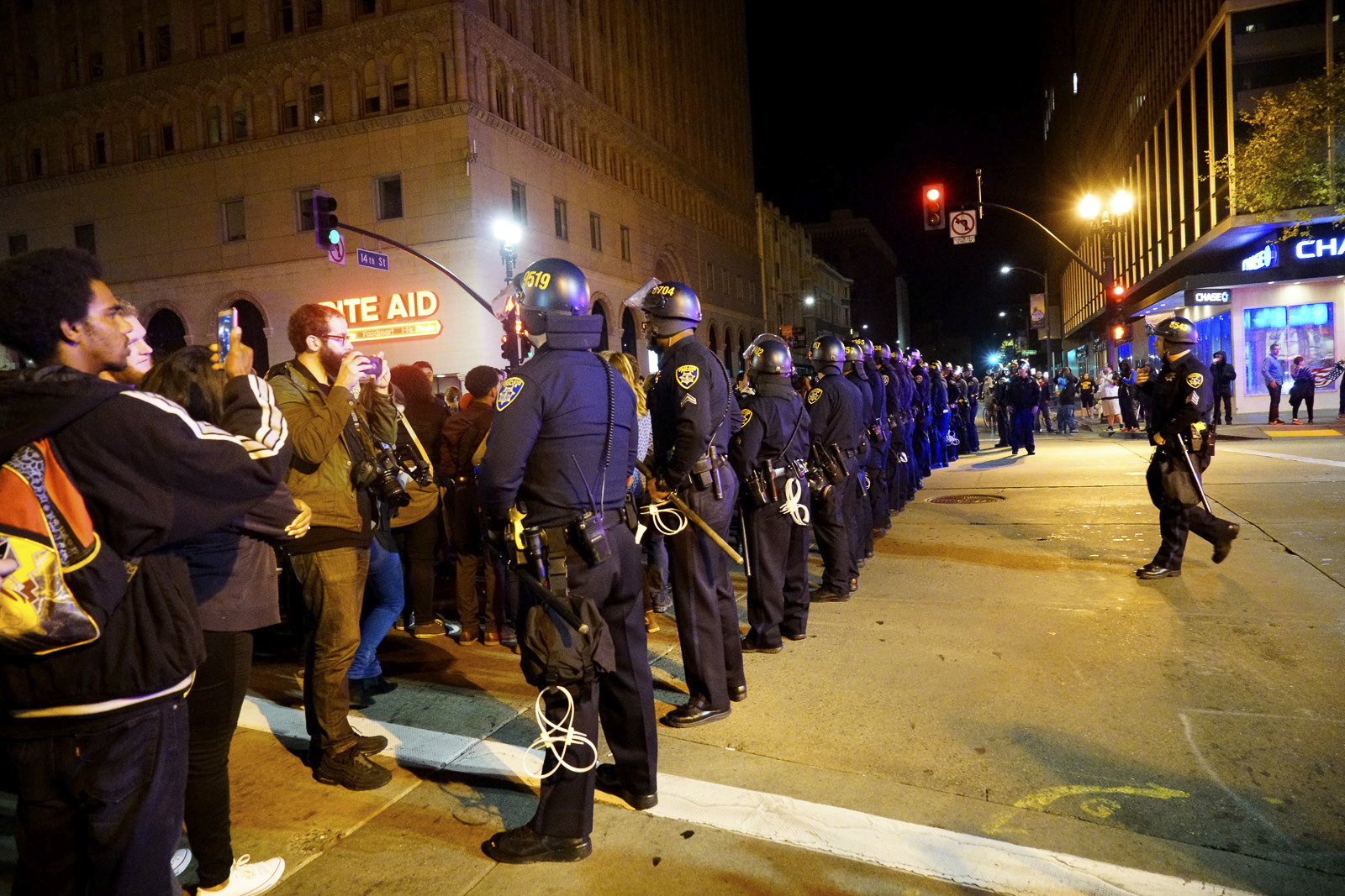 - Oakland Police Department officers meet protestors marching down 14th Street and Broadway at 1:40 a.m. on Wednesday, November 9, 2016. (Yesica Prado/Oakland North)