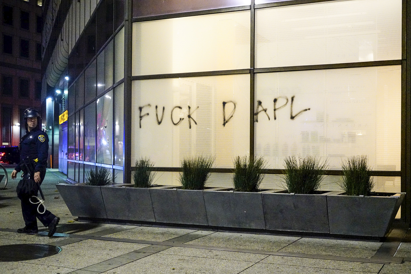 - An Oakland police officer walks past a vandalized window that states “Fuck DAPL,” on Wednesday, Novemeber 9, 2016. (Yesica Prado/Oakland North)