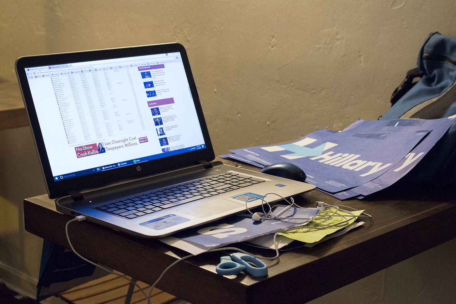 - A laptop displaying unfavorable election results for Clinton, sits on top of campaign signs at the Hillary for America, Oakland HQ. Photo by Olivia Rempel.