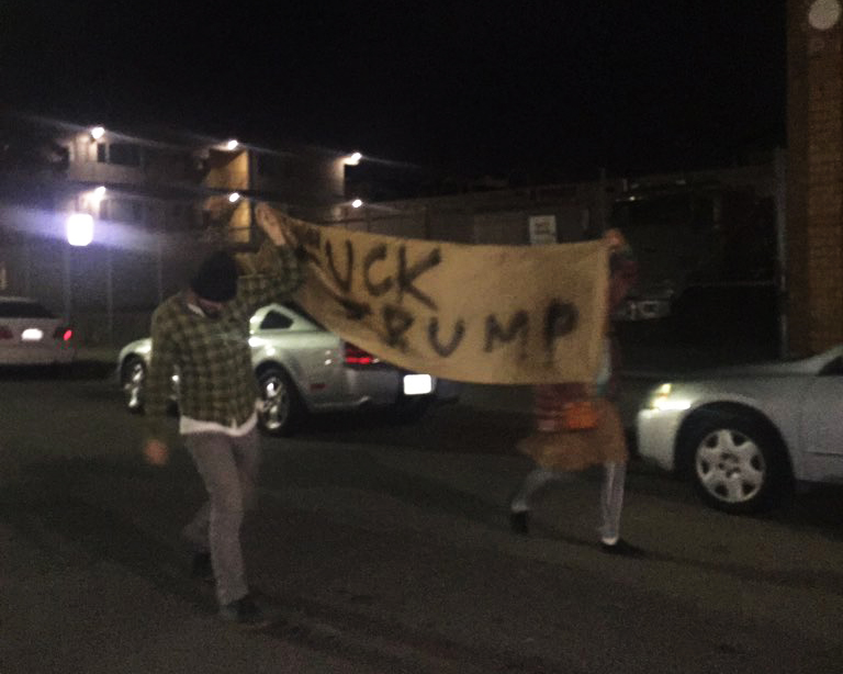 The crowd chanted and carried signs with the slogans “Fuck Trump,” “Fuck the fascist USA,” and “Fuck the KKK.” Protesters were also asking patrons of downtown bars to get out and join them in the streets. Police followed them, but as of midnight had not intervened.