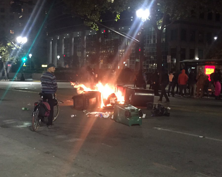- Trash on fire at the demonstration in downtown Oakland. Photo by Misyrlena Egkolfopoulou.