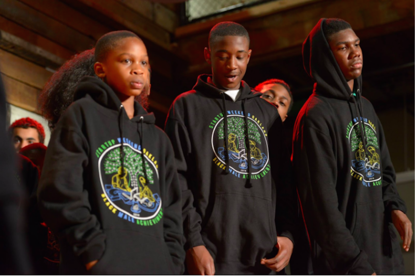 - Young African American teens participate in a Qeyno Labs hackathon wearing hoodies. Photo by Qeyno Labs.