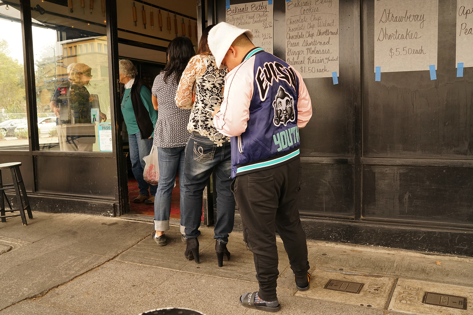 From the new vantage point of customers seated at one of the weathered ironing boards turned sidewalk tables, the quickly shifting and now buzzing line is a pan shot of the city of Oakland. A muscly man labeled “Coach Valdez” by the back of his t-shirt arrives just before a Walgreen’s pharmacist, who beats a young fashion-forward dude. He wears a fuzzy pink bucket hat, silk bomber jacket and Givenchy-branded sandals, and taps on his phone in line, pauses to order from Betty, then picks up the tapping throughout his meal.