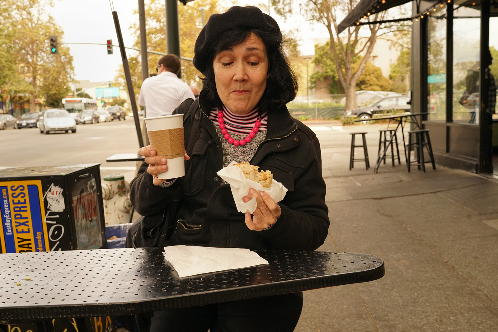 Nearby, a woman in all black, including a black beret, with a chunky pink necklace for a pop of color, settles in. She’s an artist and an associate professor at California College of the Arts. “We need an art scene in the Bay Area,” she says. “We were pushed out of the city and now we’re being pushed out of here. We will resist it, though.” She says this stretch of Telegraph is extremely interesting for people-watching. She smiles and turns back to her pear and ginger scone, which she loves, and says she’s been coming here since Betty opened her first store in 2005.