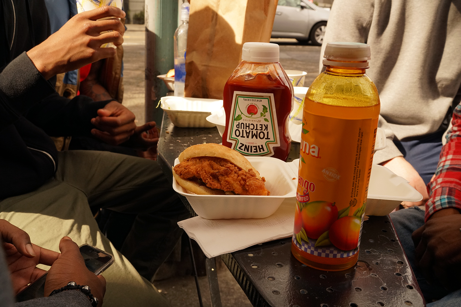 - Five high school grads brought their own ketchup to delicately enhance their sandwich experience.