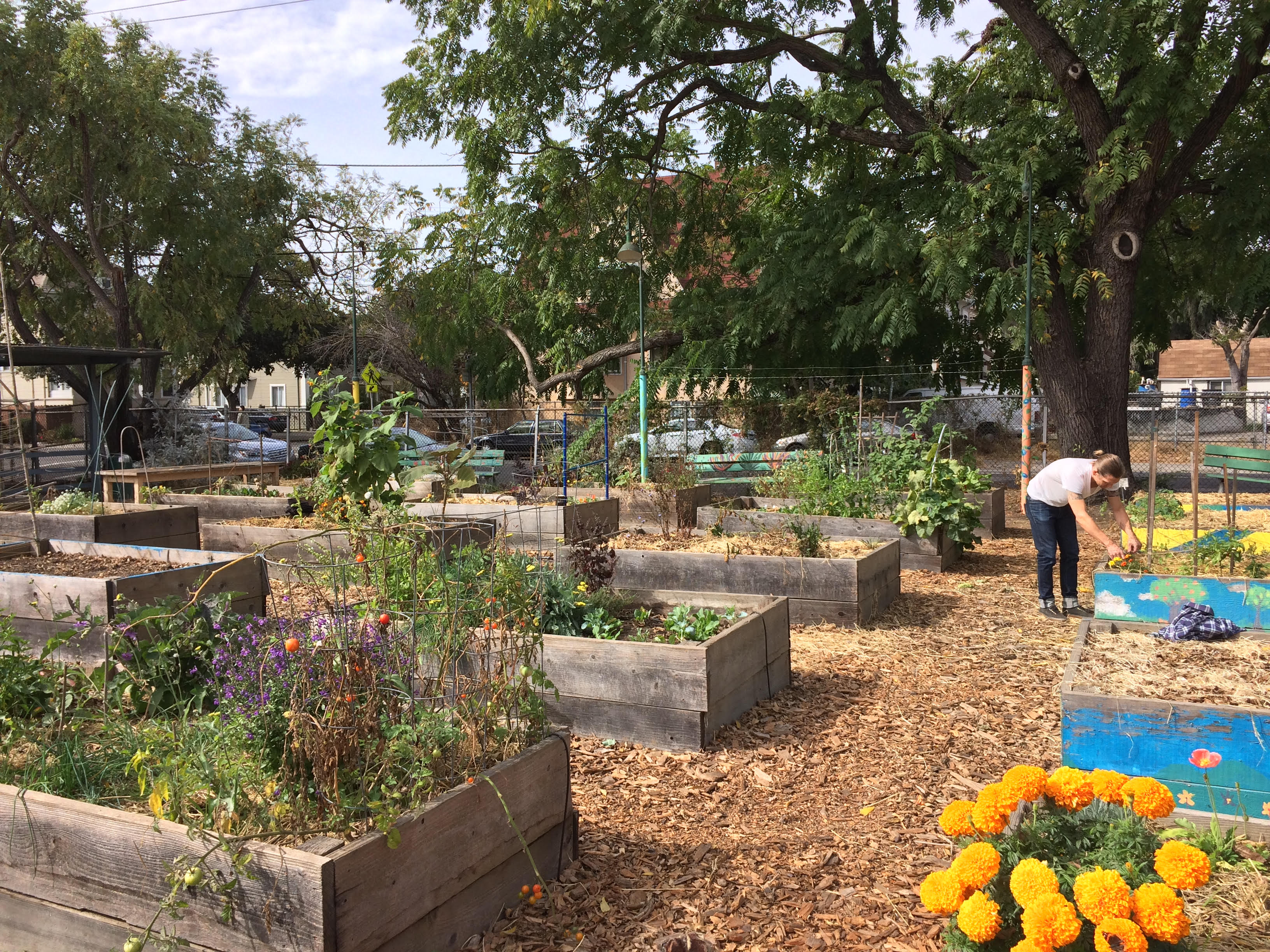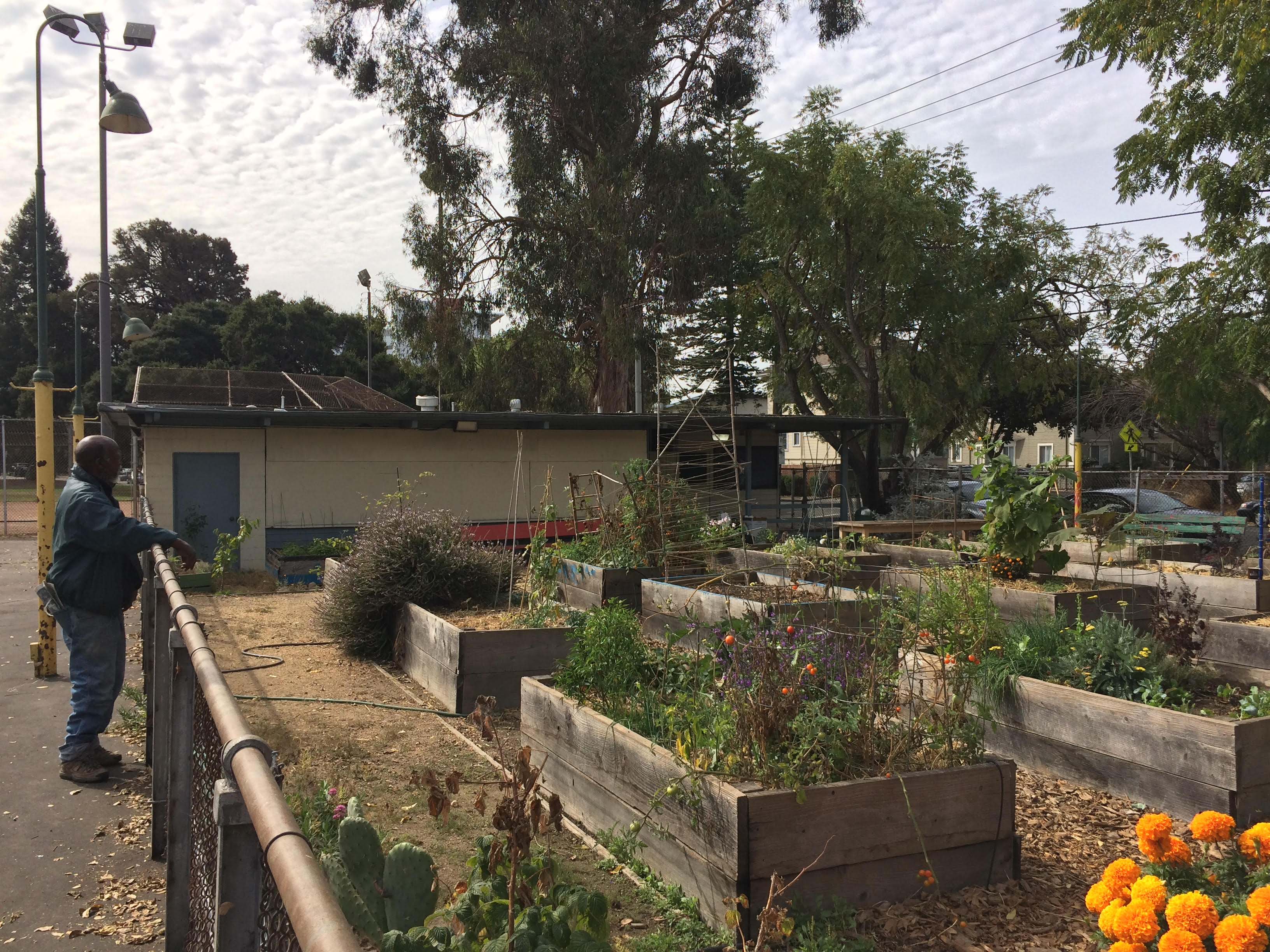 Jesse, a member of Mosswood Community Garden, tends to his plot. It looks as if tomatoes are a common yield in the garden, as are a mix of bright orange and yellow flowers. Some plots are more barren than others. The man speaks to Jesse. Jesse speaks back. They make some sort of verbal agreement. He returns to his seat.