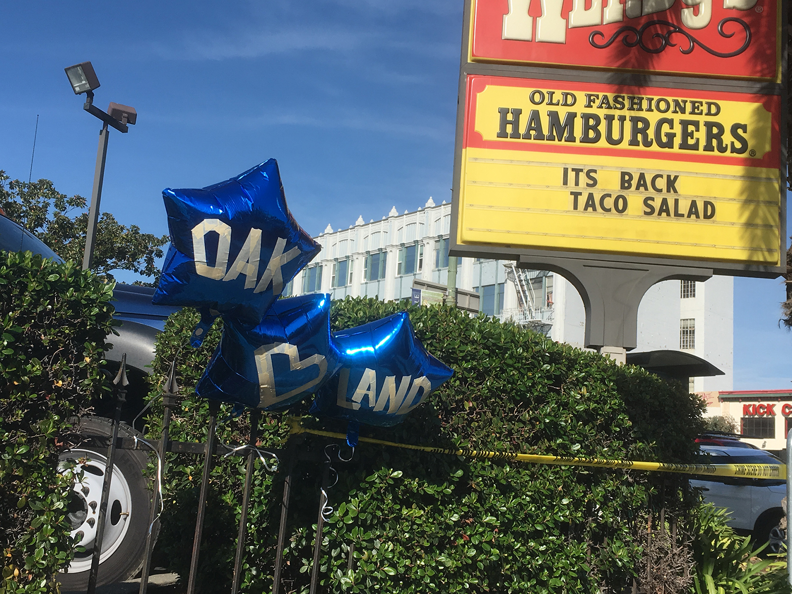 - People left balloons with a message for Oakland outside the cordoned-off area. Photo by Sonner Kehrt.