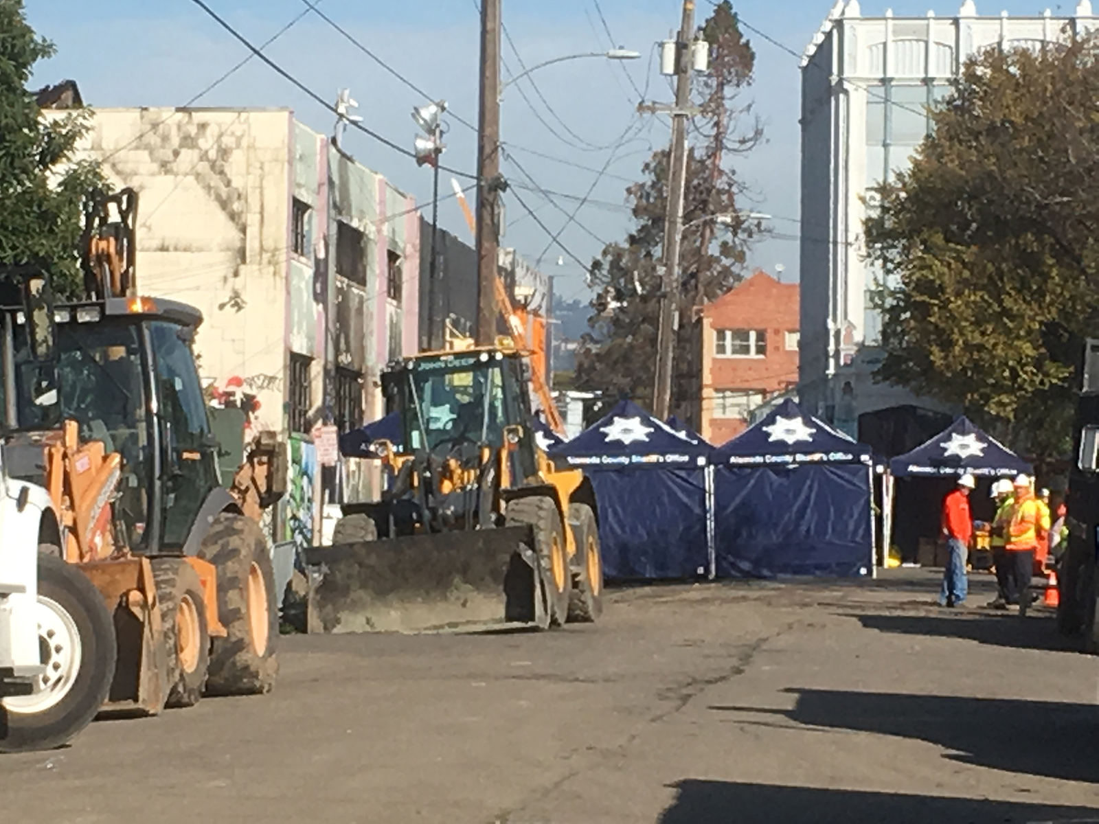 Several workers in yellow vests and hard hats could be seen carrying shovels around the building’s perimeter, and authorities had blocked off a roughly two-block area with yellow crime scene tape, stopping traffic in the area between International Boulevard, Fruitvale Avenue, Derby and 12th Streets.