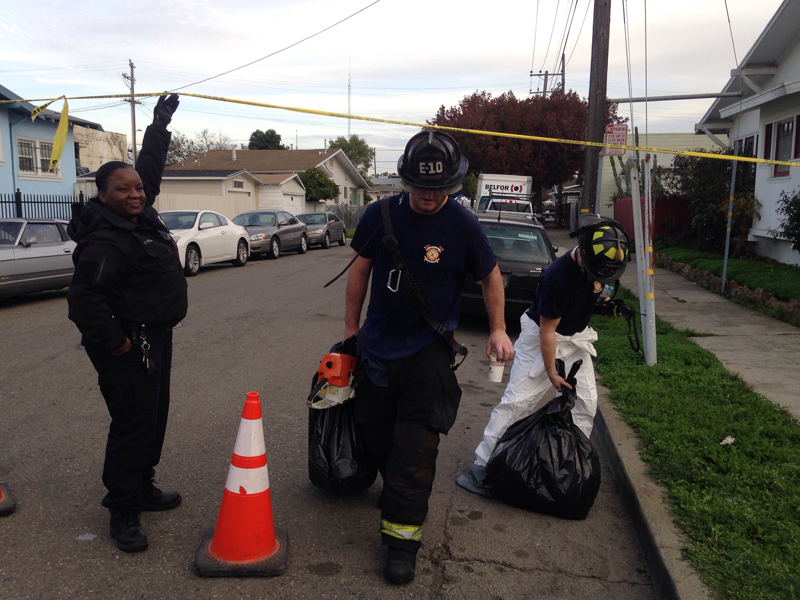 During the afternoon, firefighters began using lumber to build a ramp, which Oakland Police Department spokesperson Officer Johnna Watson said would be used to help bring equipment inside the structure to clear debris and process the scene. She said firefighters were also building supports to shore up the interior of the building so it is safe for police officers and firefighters to go inside; as they remove debris, they are worried that they are compromising the structure of the building.