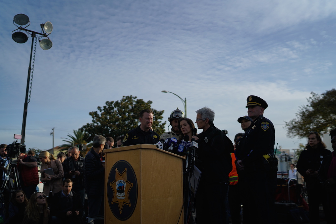 - Oakland Mayor Libby Schaaf (at podium), Oakland Police Department spokesperson Officer Johnna Watson (right) and other law enforcement officials spoke at a press conference late Sunday afternoon. Photo by Margaret Katcher.