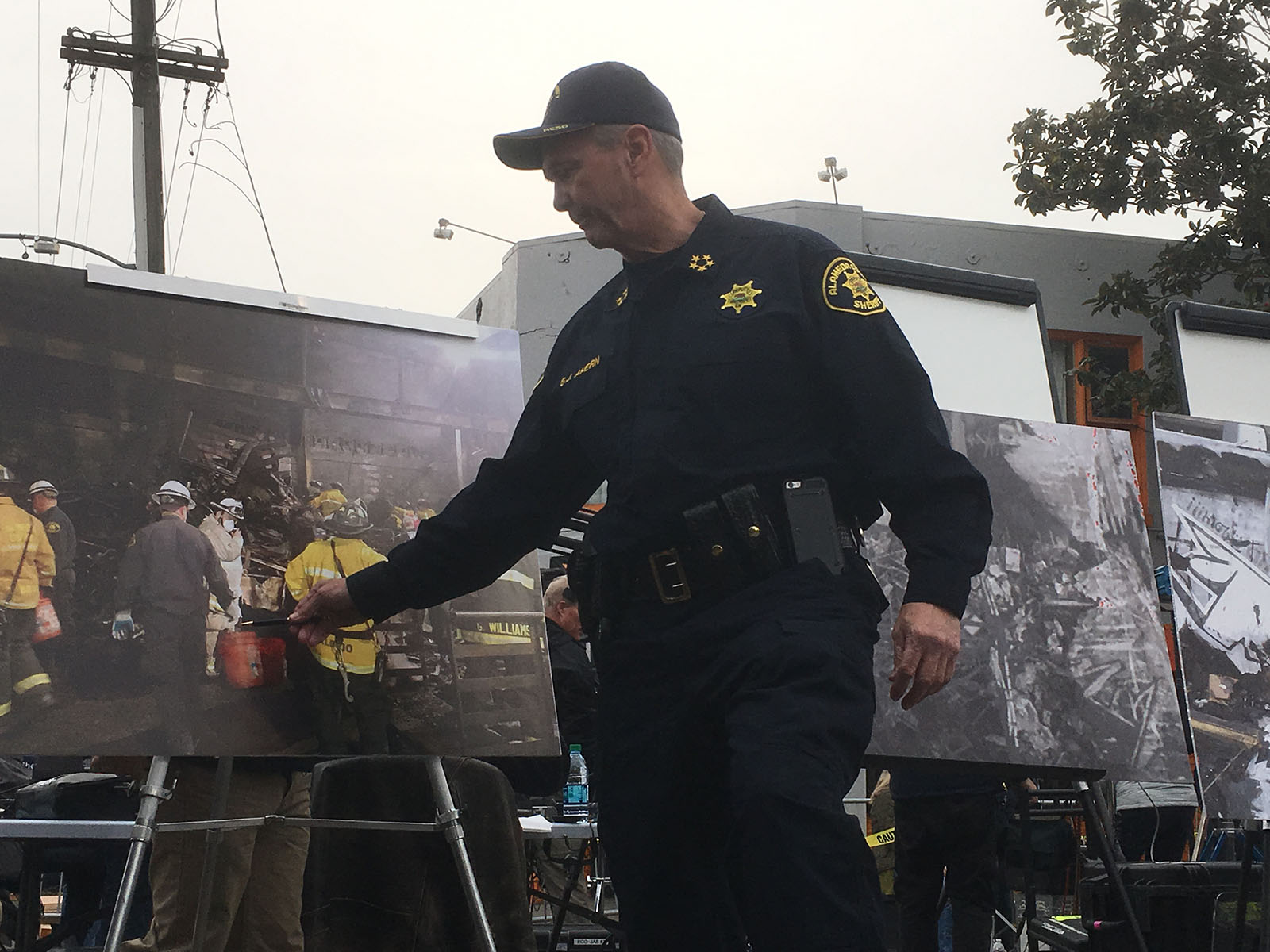 - Alameda County Sheriff Gregory Ahern points to a photograph of firefighters preserving debris as evidence. Original image courtesy of the Oakland Police Department.