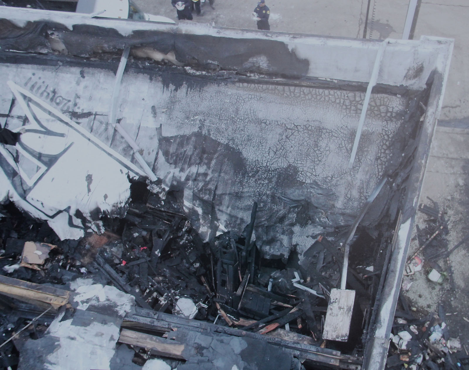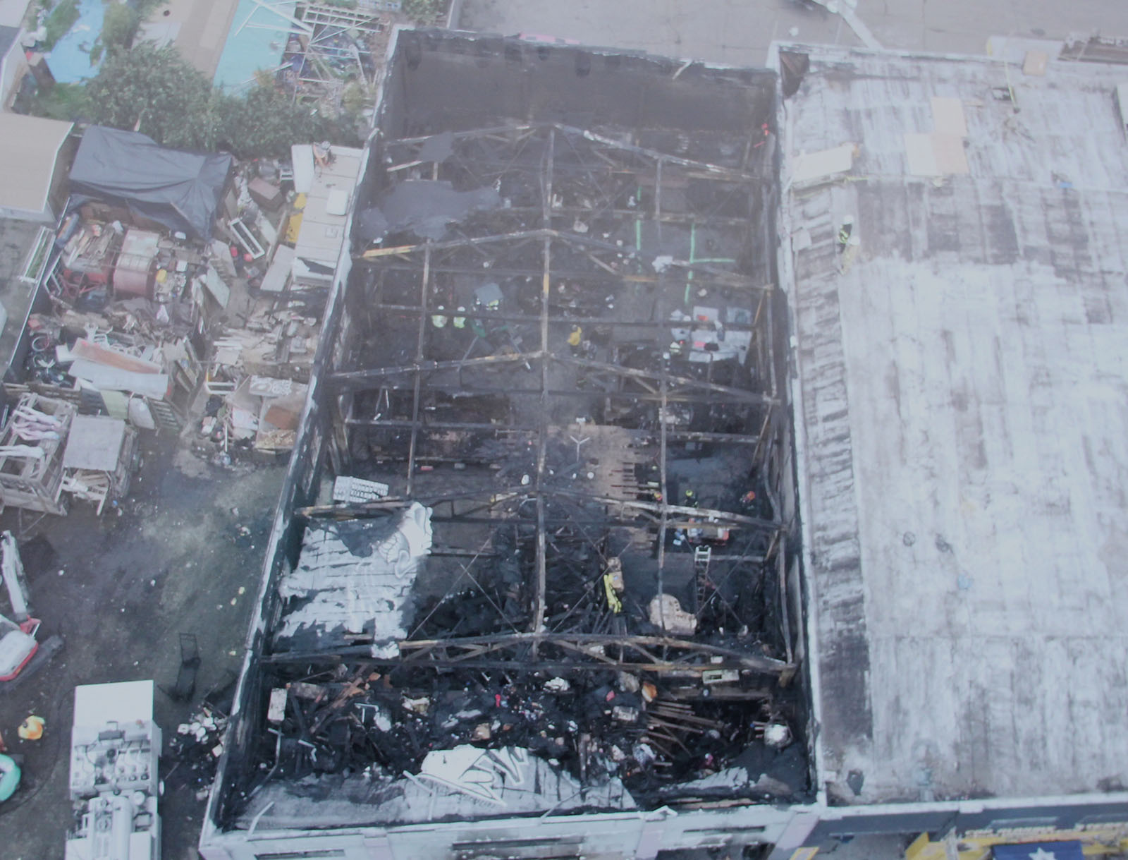 - Aerial view of warehouse after fire. Original image courtesy of the Oakland Police Department.