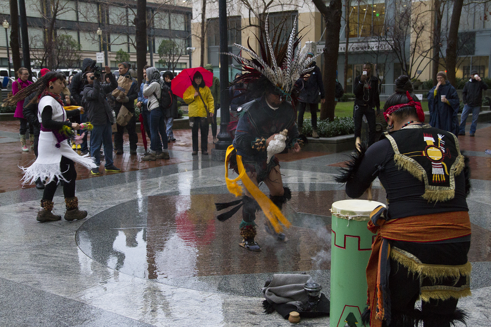 East Bay Area Danzantes, Mexica, a group of Aztec dancers, led a ceremonial dance using drums, hand percussion and a conch shell. “We’re resisting this lie of this president and we’re resisting the hate and the racism and the white supremacy and that that is the medicine of this prayer,” said dancer Tiny Garcia of Poor Magazine.