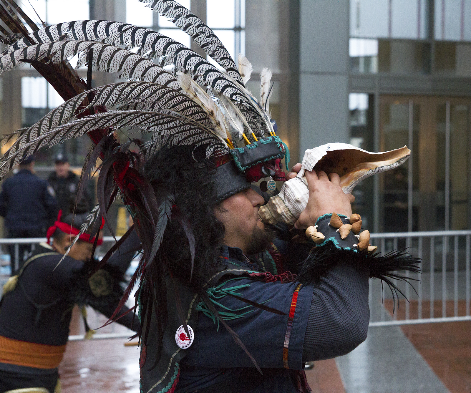 - An indigenous dance leader blows a conch during his performance. Indigenous activists stated that demonstrating against Trump is part of a fight “to decolonize ourselves.” Photo by Abner Hauge.