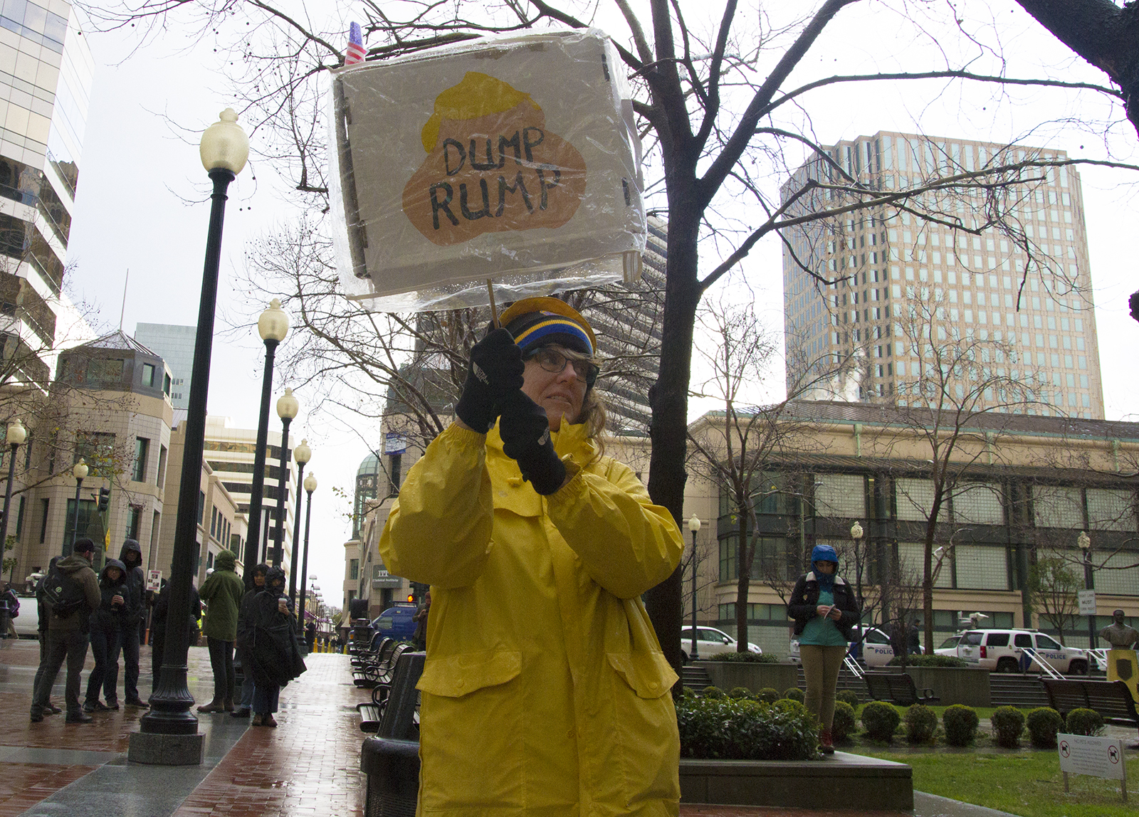 “I think my sign speaks for itself,” said protester Jane Perry, who was carrying a “Dump Rump” sign made out of a storage box and wrapped in plastic to protect it against the drizzle. “I’m here to support compassion in government.”