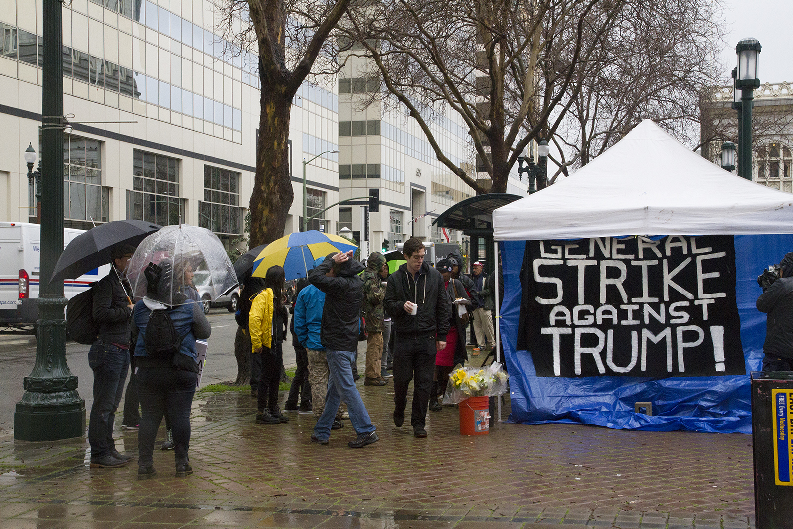 By 9 am, the protest outside the federal building had died down, and most of the protesters had moved over to Frank Ozawa Plaza in front of Oakland City Hall, where organizers were setting up tents and passing out warm food in preparation for a strike and march planned to begin at noon.