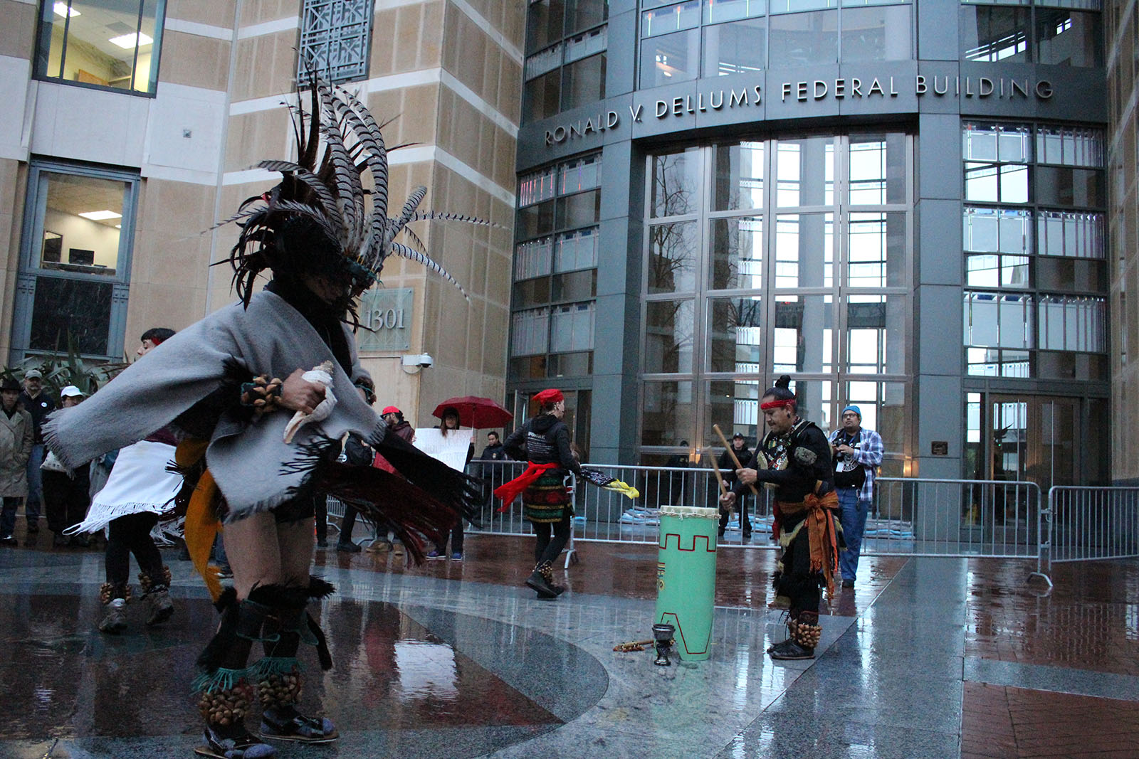- Demonstrators opened the protest at Ronald V. Dellums Federal Building in Oakland Friday morning with a prayer and ritual dance. Photo by Abner Hauge.