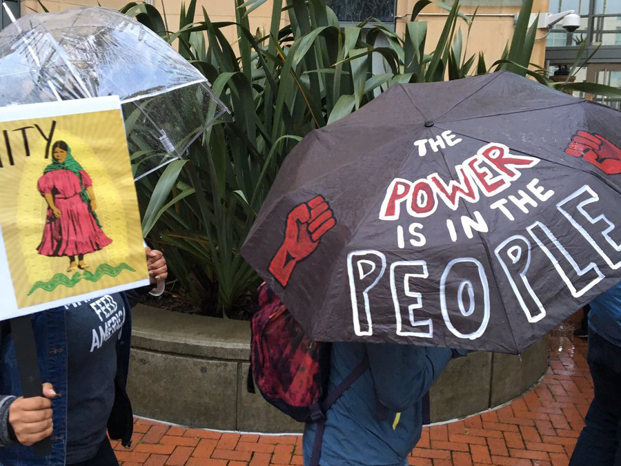 - A Trump inauguration protester outside the Ronald V. Dellums federal building in Oakland carries a painted umbrella with a message. Photo by Abner Hauge.