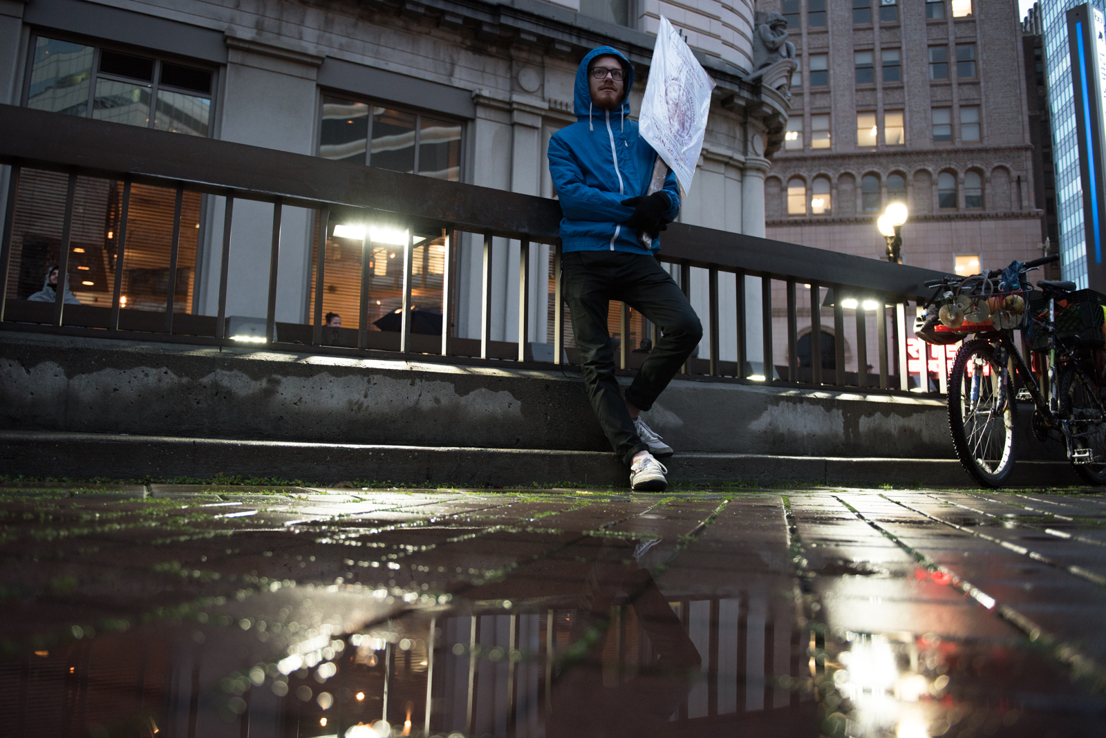 After a day of marches, public speeches and rallies, as night fell and the rain came down, demonstrators gathered once again in downtown Oakland to march in protest of Donald Trump’s inauguration.