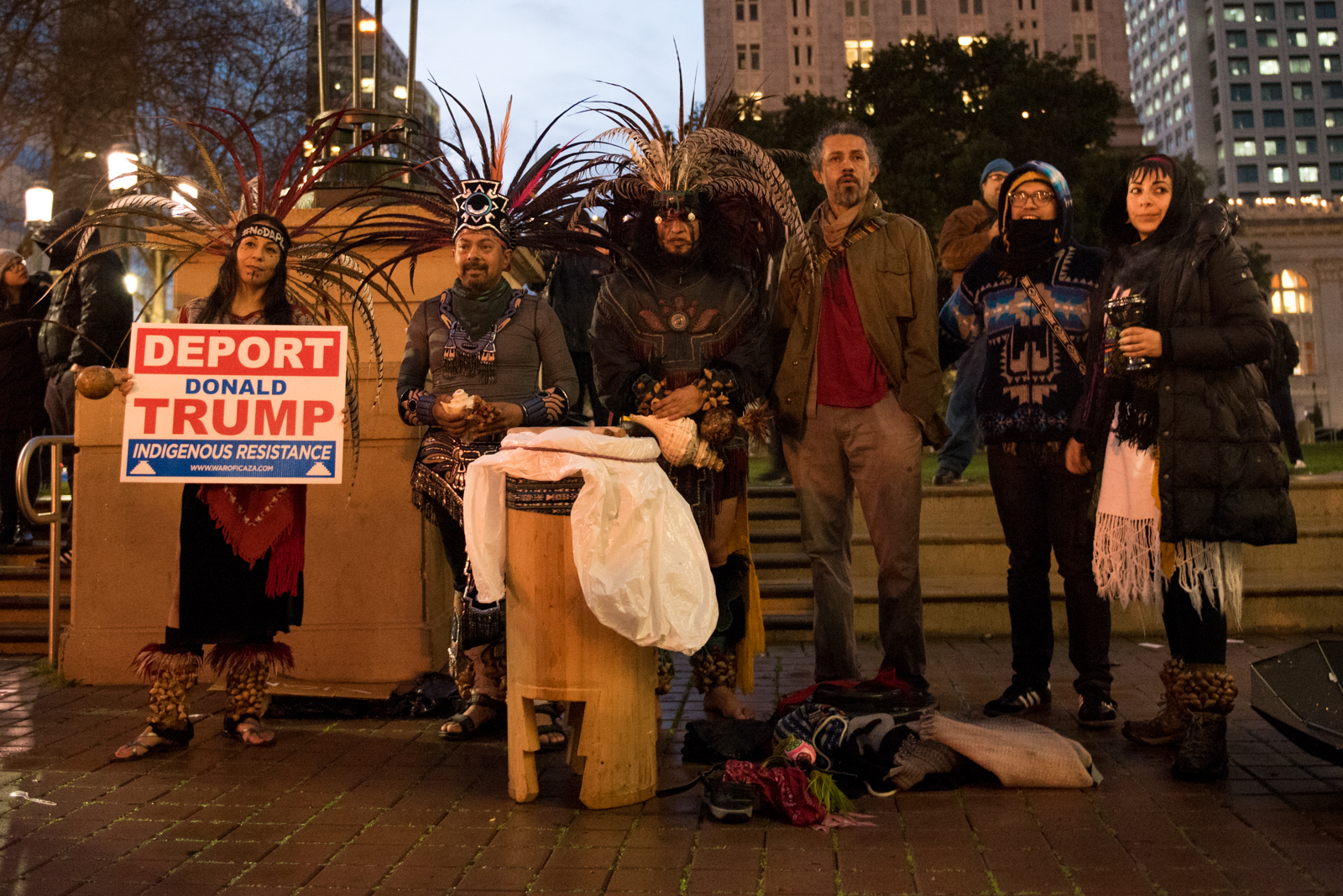 - East Bay Area Danzantes, Mexica, a group of Aztec dancers, led ceremonial dances throughout the protest on Friday. Photo by Rosa Furneaux.