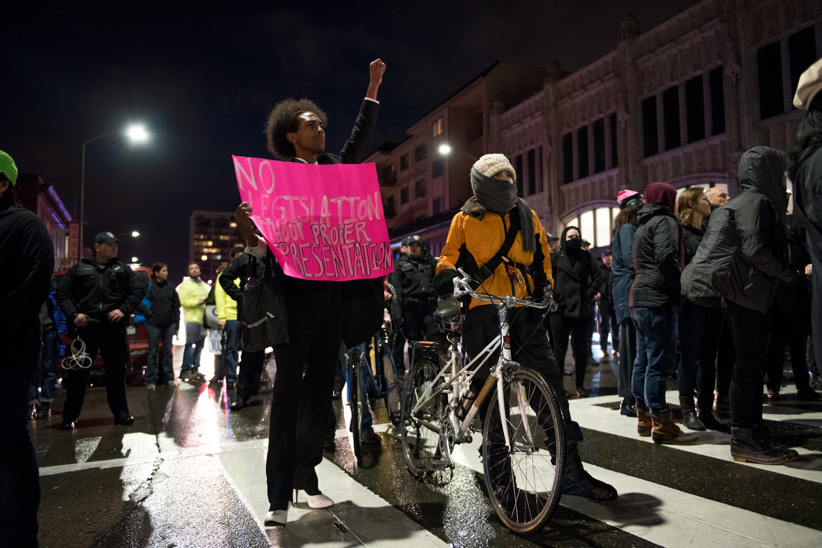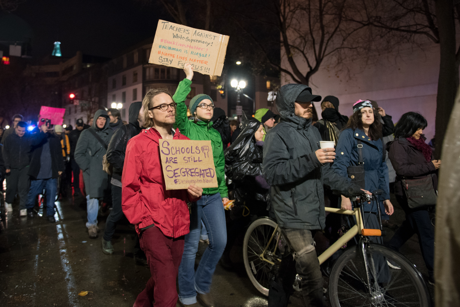 As of 7:45 pm, a police line surrounded the plaza, preventing protesters from being able to march in any direction. “We just want to march!” and “This is about Trump!” some of the protesters called to the officers. By this point, the crowd had shrunk to fewer than 100 people.