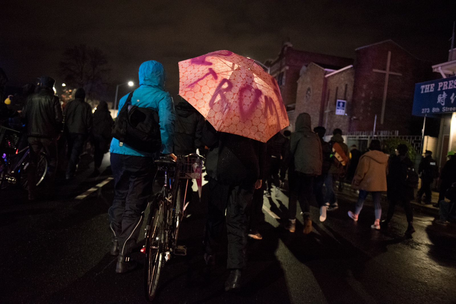 - Although rain was forecast, the evening march was mostly dry. Here, marchers walk along Broadway under an umbrella-turned-protest sign. Photo by Rosa Furneaux.