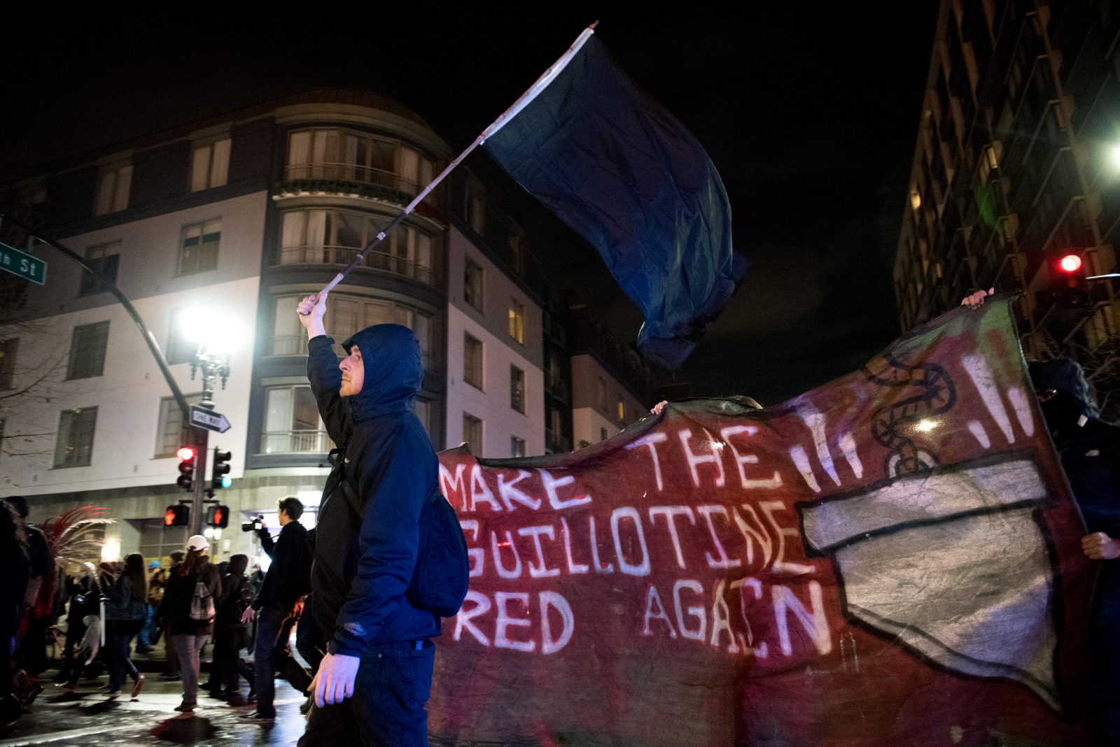 - A protester with a black flag is followed by a banner which reads “Make the Guillotine Red Again”, in reference to President Donald Trump’s popular campaign slogan. Photo by Rosa Furneaux.