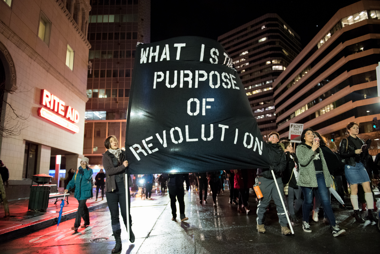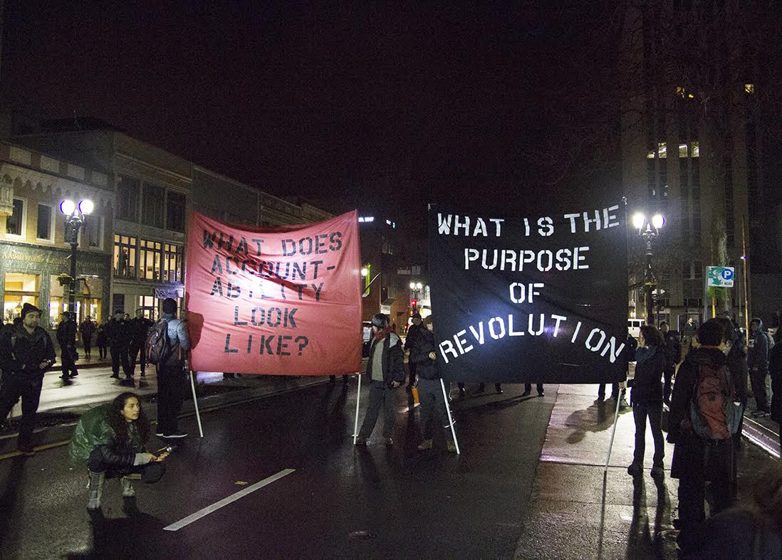 - Protesters carried giant banners at the back of the march that read “What does accountability look like?” and “What is the purpose of revolution?” Photo by Abner Hauge.