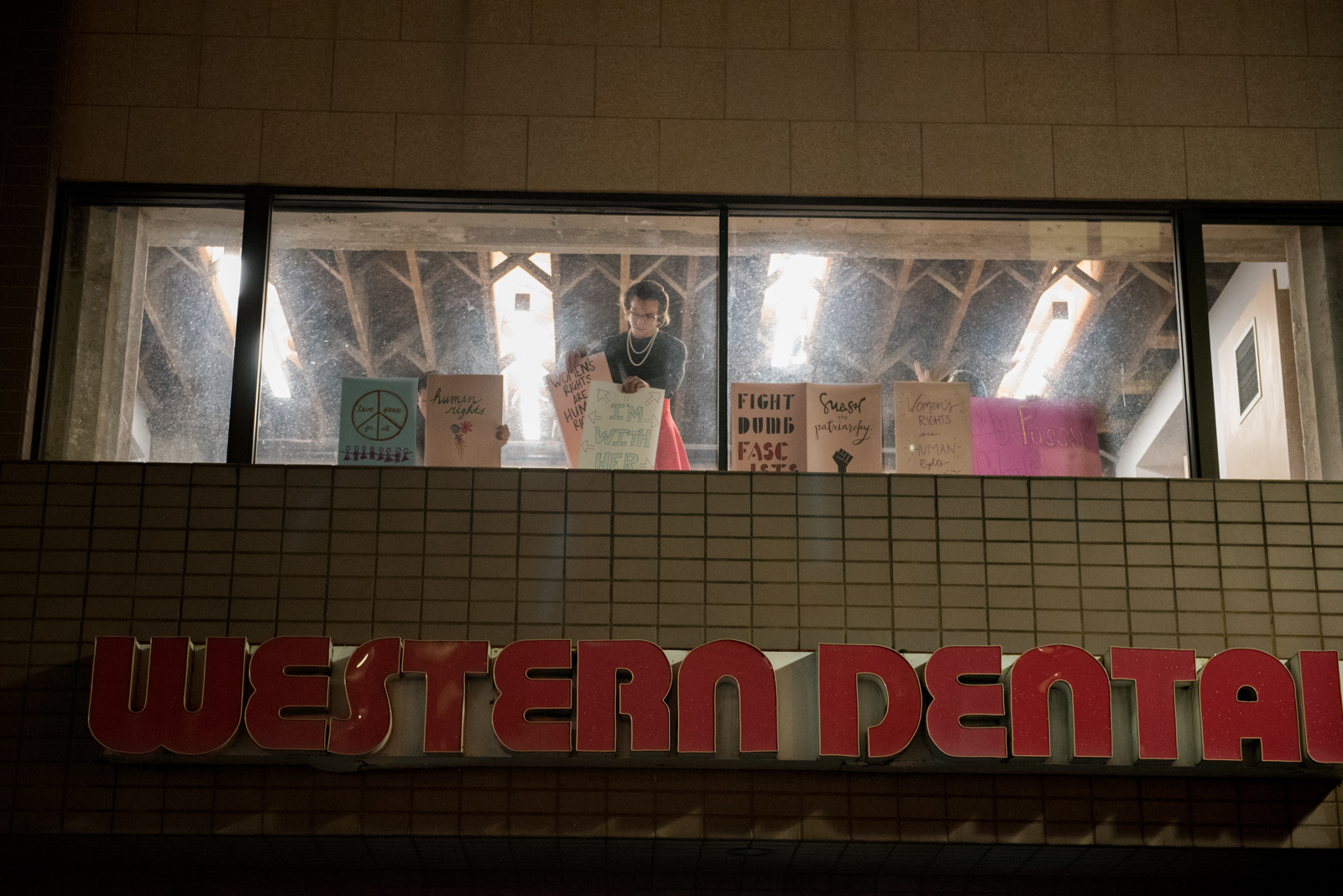 - Women set up signs in a window above Western Dental on Broadway, signalling their support for protest against President Trump. Photo by Rosa Furneaux.