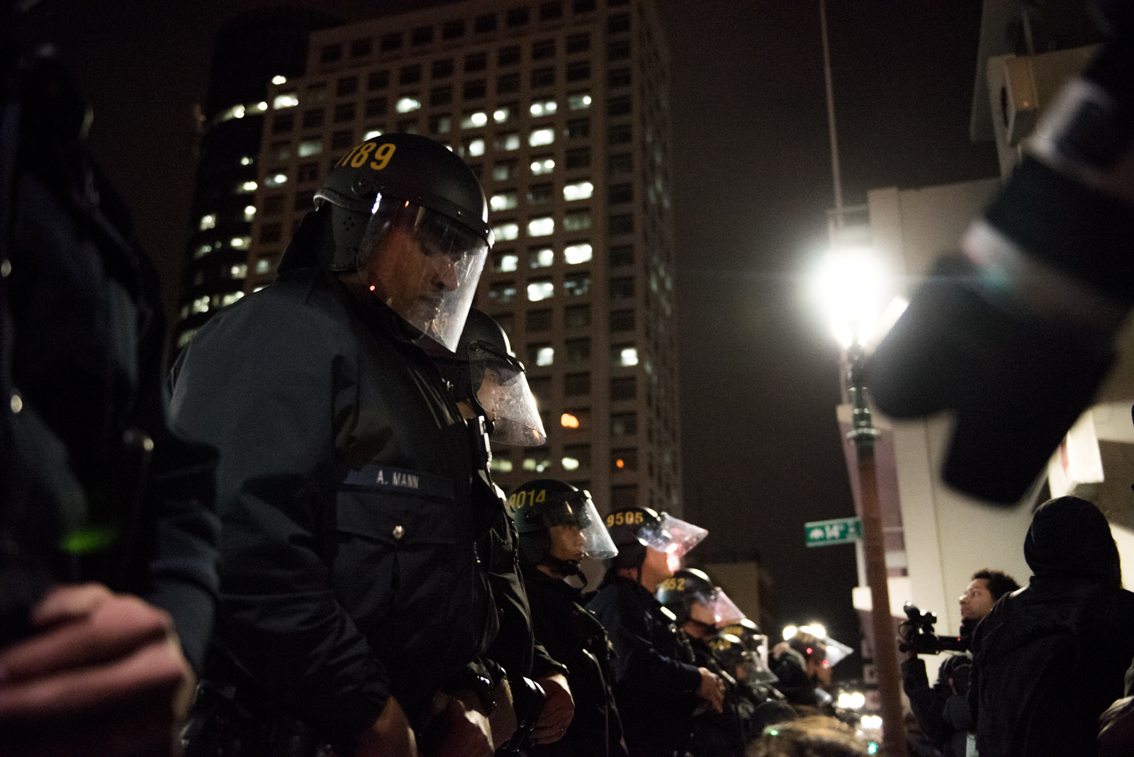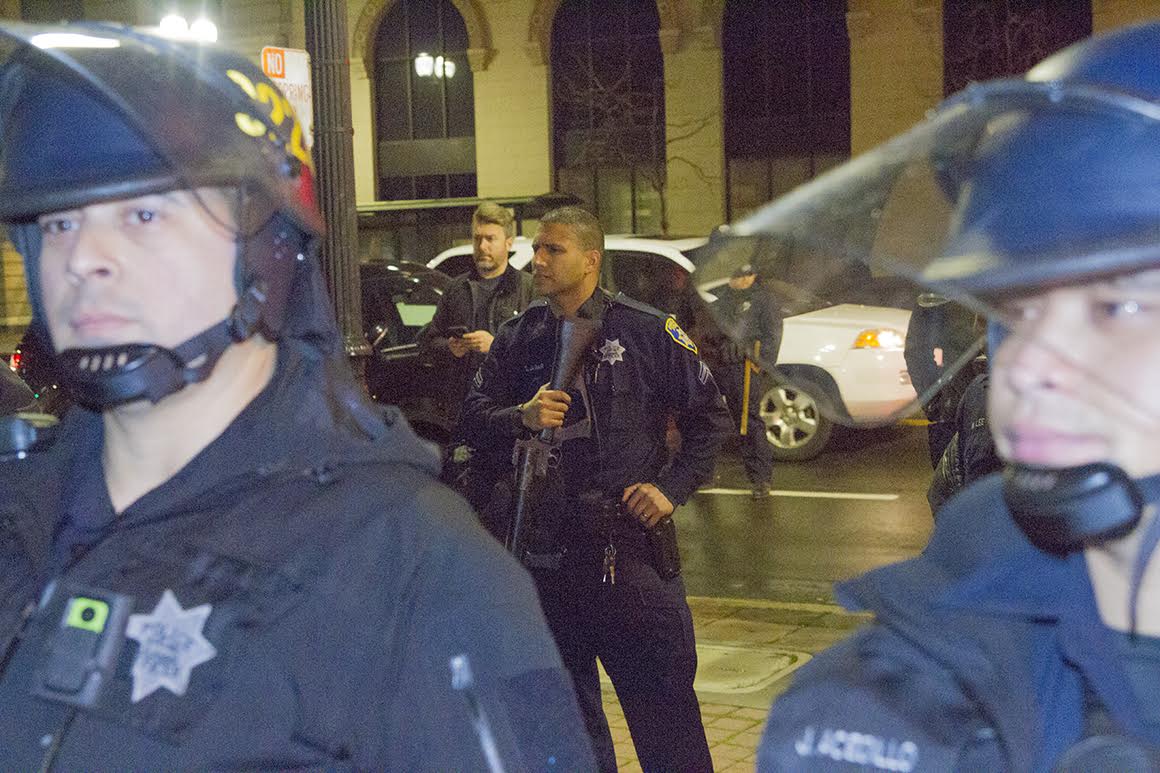 - Police in riot gear faced off with protesters, as marchers attempted to walk along 14th Street. Tensions were high, but the protesters eventually returned to Frank H. Ogawa Plaza. Photo by Rosa Furneaux.