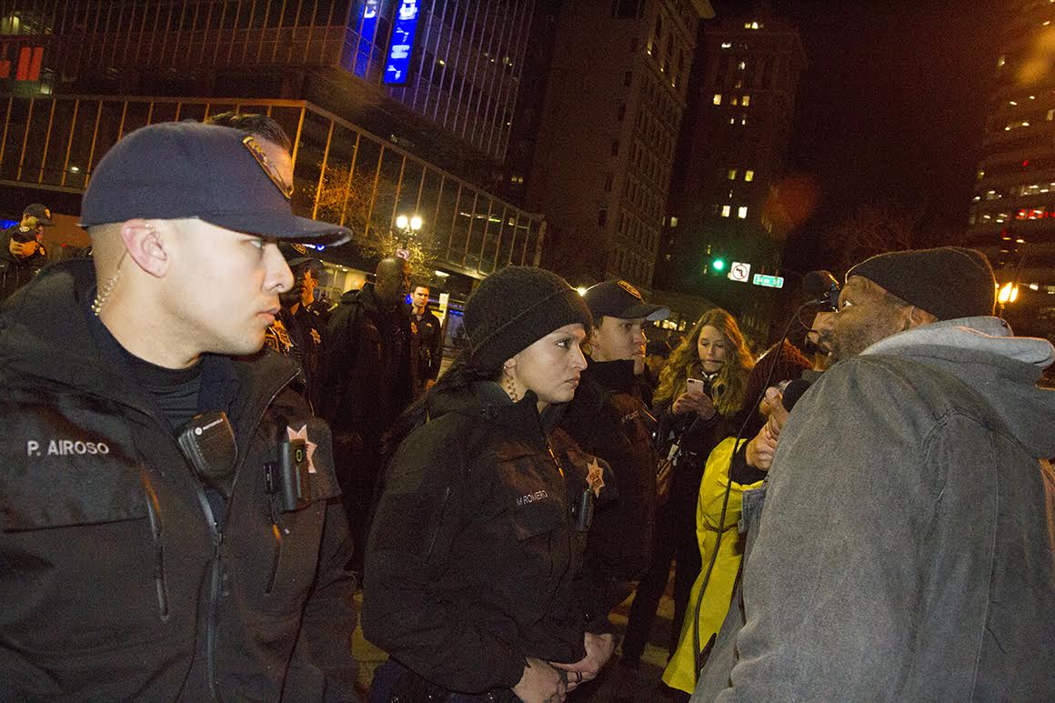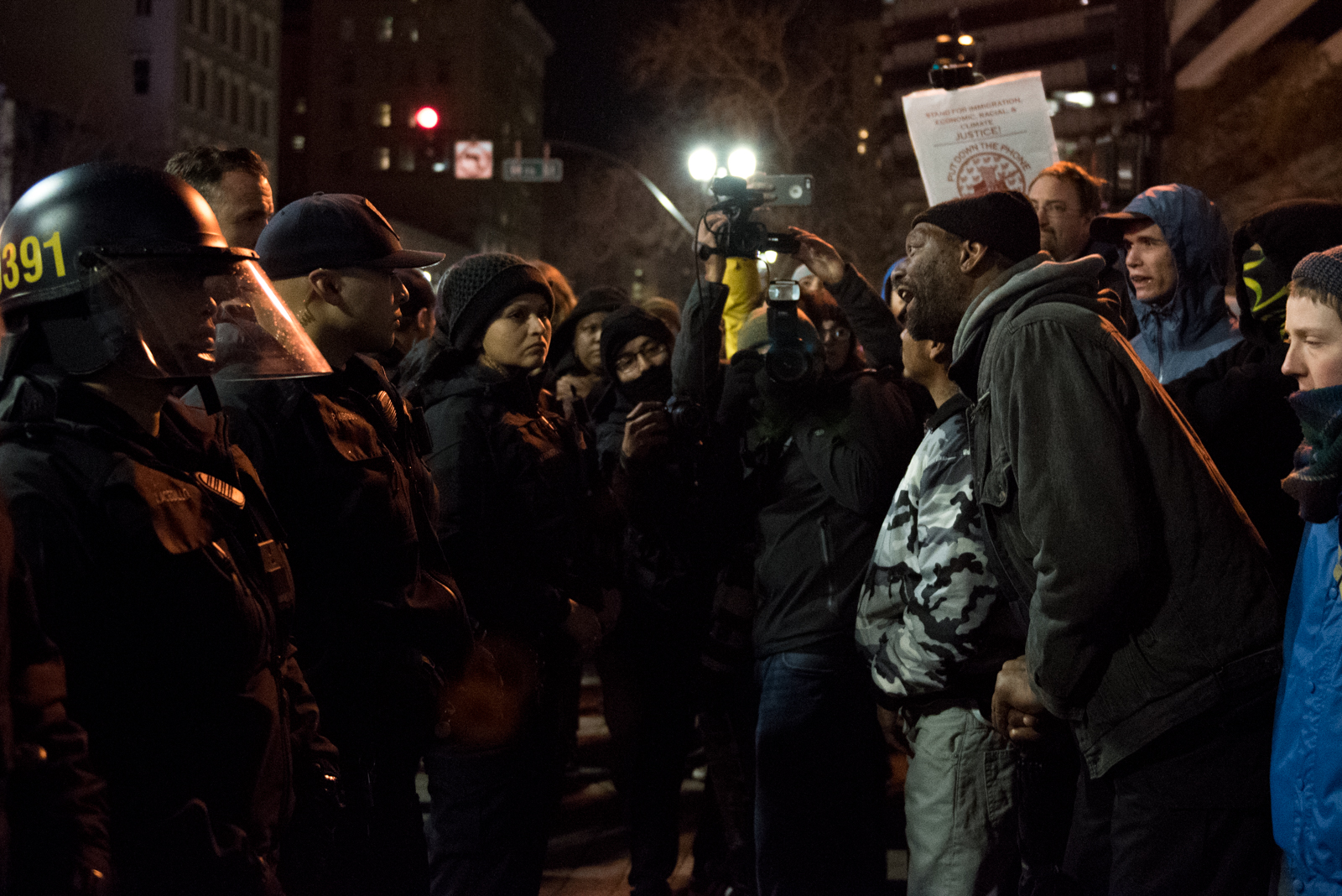 - Towards the end of the night, protesters’ anger was directed at the Oakland Police Department. Here, a man shouts at officers as they prevent marchers from walking again on Broadway. Photo by Rosa Furneaux.