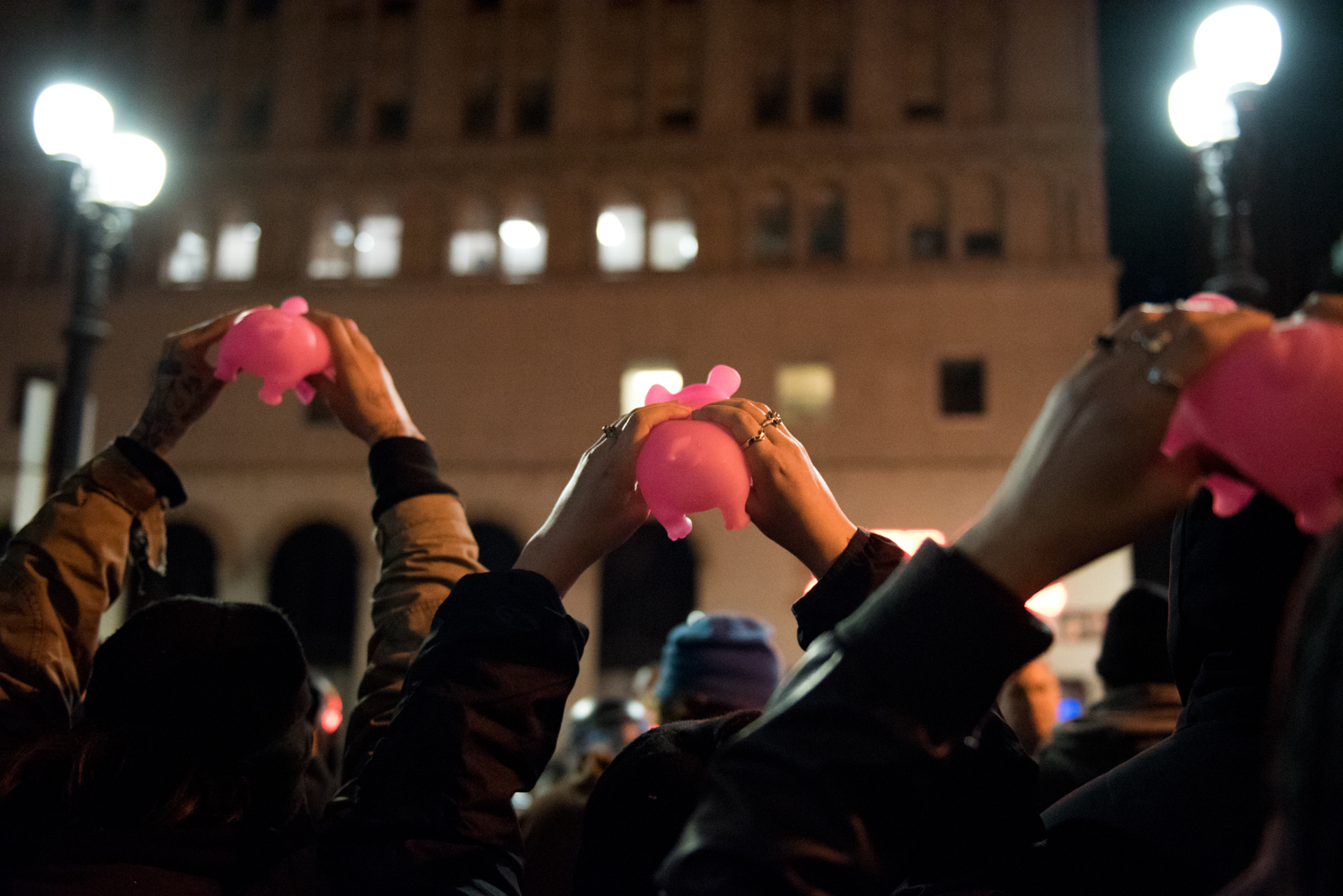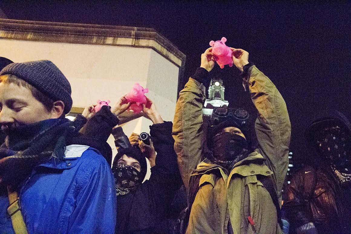 - At the end of the night, protesters taunt Oakland Police Department with oinking rubber pigs. Photo by Rosa Furneaux.